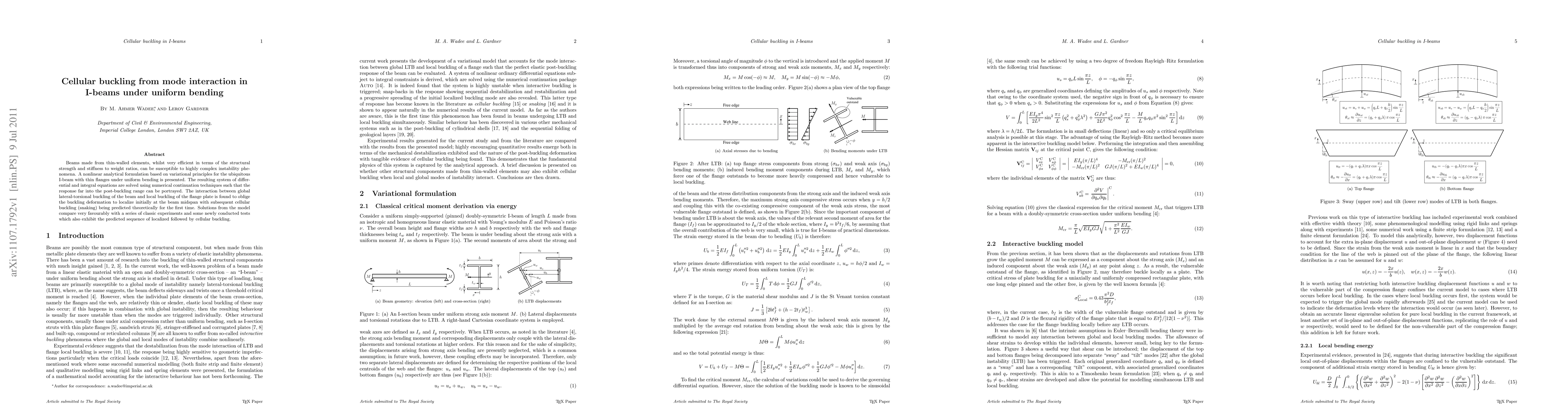 This research develops a nonlinear analytical model for I-beams under uniform bending, revealing complex instability phenomena including cellular buckling. Numerical continuation techniques predict the interaction between global and local buckling, initially localizing at midspan and then leading to cellular buckling, corroborated by experimental validation.