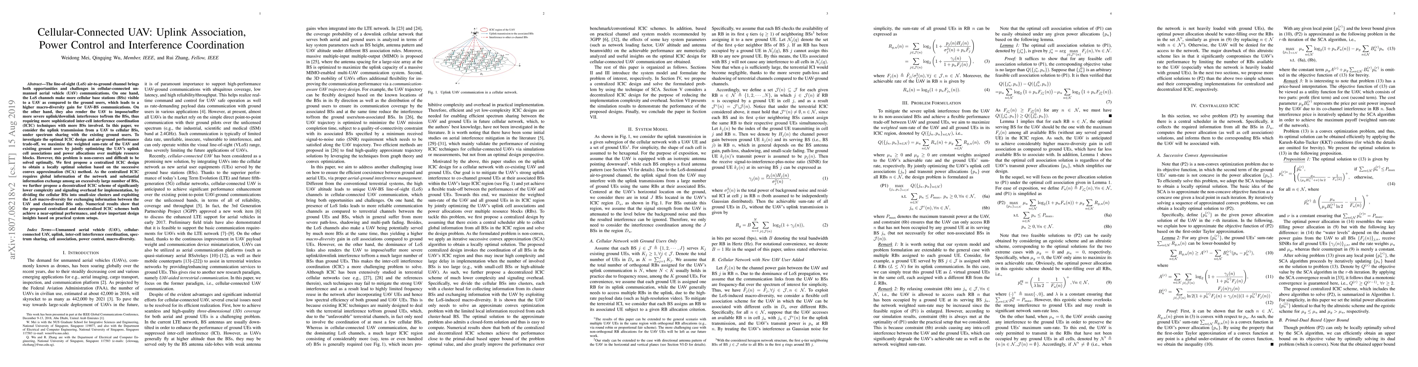 This paper investigates cellular-connected UAV communication, focusing on uplink association, power control, and interference coordination. It proposes both centralized and decentralized interference coordination schemes to optimize UAV-BS communication under spectrum sharing with ground users, achieving near-optimal performance with reduced complexity.