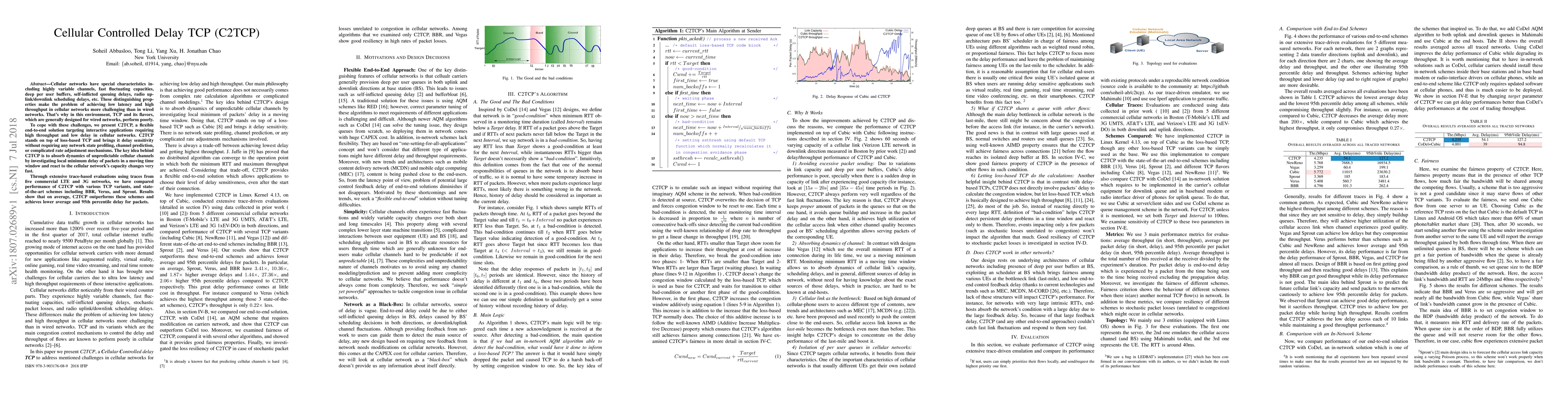 C2TCP is a novel TCP variant designed to enhance throughput and reduce latency in cellular networks by dynamically adjusting to variable channel conditions. It outperforms other TCP variants and state-of-the-art schemes in trace-based evaluations, achieving lower average and 95th percentile delays.
