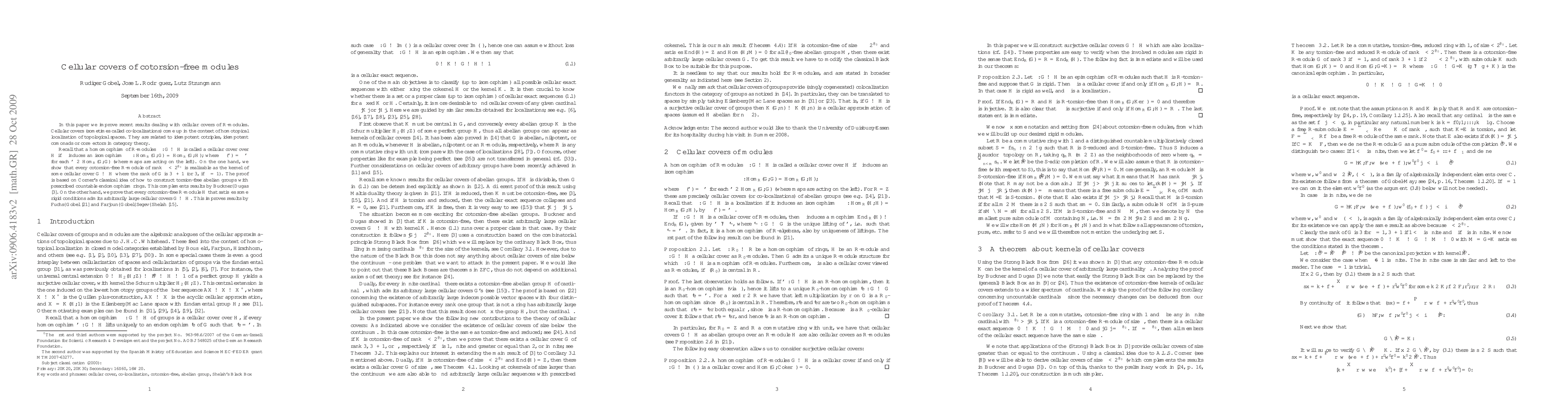 In this paper we improve recent results dealing with cellular covers of $R$-modules. Cellular covers (sometimes called co-localizations) come up in the context of homotopical localization of topological spaces. They are related to idempotent cotriples, idempotent comonads or coreflectors in category theory. Recall that a homomorphism of $R$-modules $\pi: G\to H$ is called a {\it cellular cover} over $H$ if $\pi$ induces an isomorphism $\pi_*: \Hom_R(G,G)\cong \Hom_R(G,H),$ where $\pi_*(\phi)= \pi \phi$ for each $\phi \in \Hom_R(G,G)$ (where maps are acting on the left). On the one hand, we show that every cotorsion-free $R$-module of rank $\kappa<\Cont$ is realizable as the kernel of some cellular cover $G\to H$ where the rank of $G$ is $3\kappa +1$ (or 3, if $\kappa=1$). The proof is based on Corner's classical idea of how to construct torsion-free abelian groups with prescribed countable endomorphism rings. This complements results by Buckner--Dugas \cite{BD}. On the other hand, we prove that every cotorsion-free $R$-module $H$ that satisfies some rigid conditions admits arbitrarily large cellular covers $G\to H$. This improves results by Fuchs-G\"obel \cite{FG} and Farjoun-G\"obel-Segev-Shelah \cite{FGSS07}.