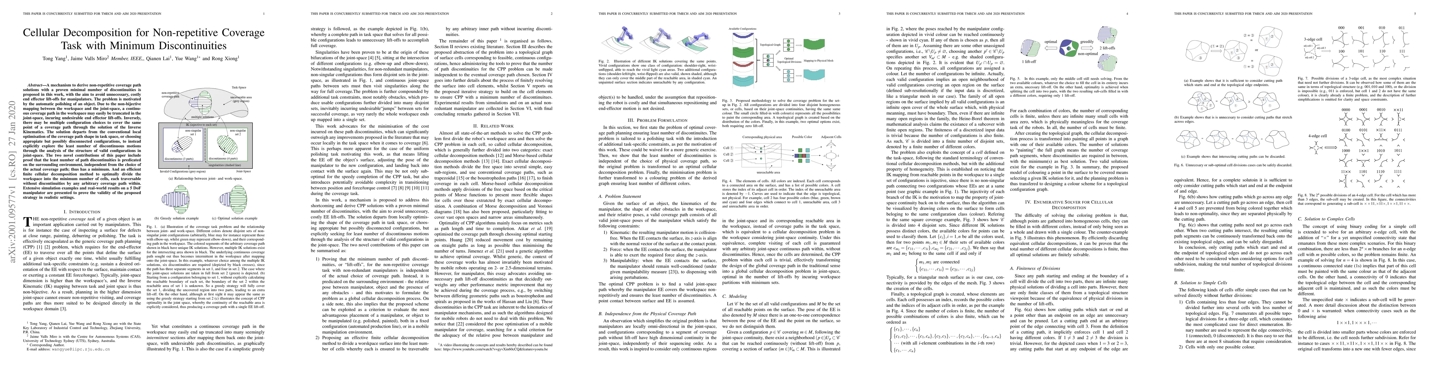 This paper proposes a method to derive non-repetitive coverage paths with minimal discontinuities to minimize costly end effector lift-offs in manipulators, particularly for automatic polishing tasks. It introduces a cellular decomposition technique to optimally divide the workspace into the fewest cells, ensuring continuous coverage paths without discontinuities.