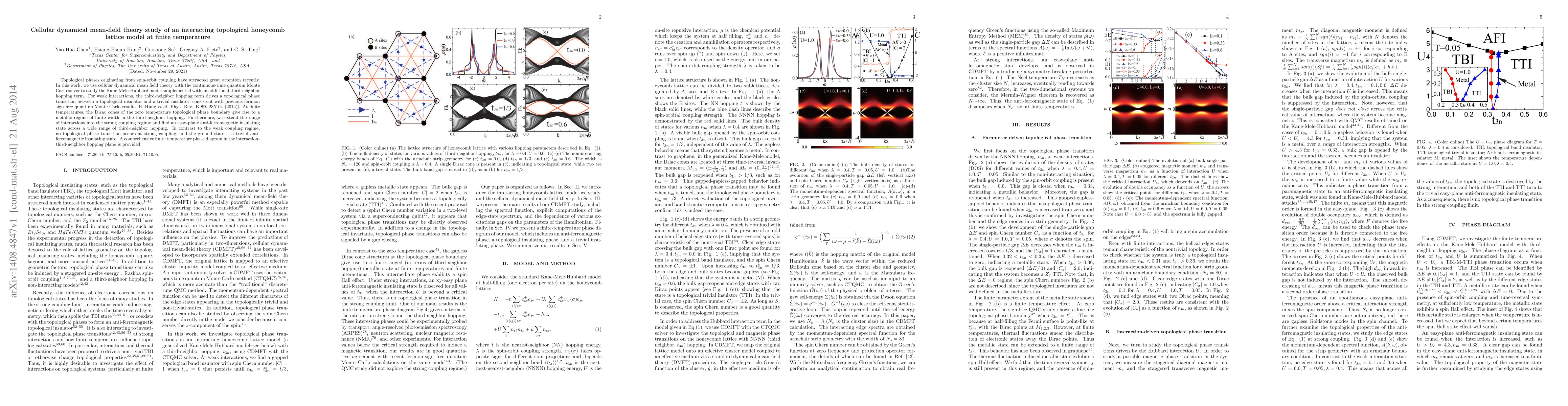 This paper employs cellular dynamical mean-field theory to investigate the Kane-Mele-Hubbard model with a third-neighbor hopping term, revealing a topological phase transition at weak interactions and a metallic regime at finite temperatures. At strong interactions, it finds an easy-plane anti-ferromagnetic insulating state without a topological phase transition.