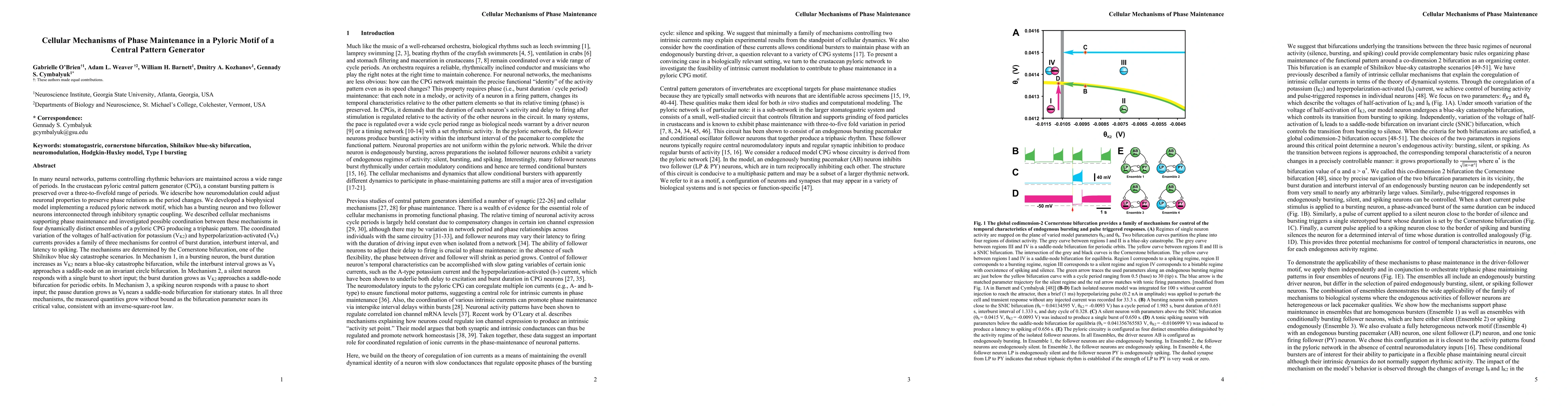 In many neural networks, patterns controlling rhythmic behaviors are maintained across a wide range of periods. In the crustacean pyloric central pattern generator (CPG), a constant bursting pattern is preserved over a three-to-fivefold range of periods. We idescribe how neuromodulation could adjust neuronal properties to preserve phase relations as the period changes. We developed a biophysical model implementing a reduced pyloric network motif, which has a bursting neuron and two follower neurons interconnected through inhibitory synaptic coupling. We described cellular mechanisms supporting phase maintenance and investigated possible coordination between these mechanisms in four dynamically distinct ensembles of a pyloric CPG producing a triphasic pattern. The coordinated variation of the voltages of half-activation for potassium (VK2) and hyperpolarization-activated (Vh) currents provides a family of three mechanisms for control of burst duration, interburst interval, and latency to spiking. The mechanisms are determined by the Cornerstone bifurcation, one of the Shilnikov blue sky catastrophe scenarios. In Mechanism 1, in a bursting neuron, the burst duration increases as VK2 nears a blue-sky catastrophe bifurcation, while the interburst interval grows as Vh approaches a saddle-node on an invariant circle bifurcation. In Mechanism 2, a silent neuron responds with a single burst to short input; the burst duration grows as VK2 approaches a saddle-node bifurcation for periodic orbits. In Mechanism 3, a spiking neuron responds with a pause to short input; the pause duration grows as Vh nears a saddle-node bifurcation for stationary states. In all three mechanisms, the measured quantities grow without bound as the bifurcation parameter nears its critical value, consistent with an inverse-square-root law.