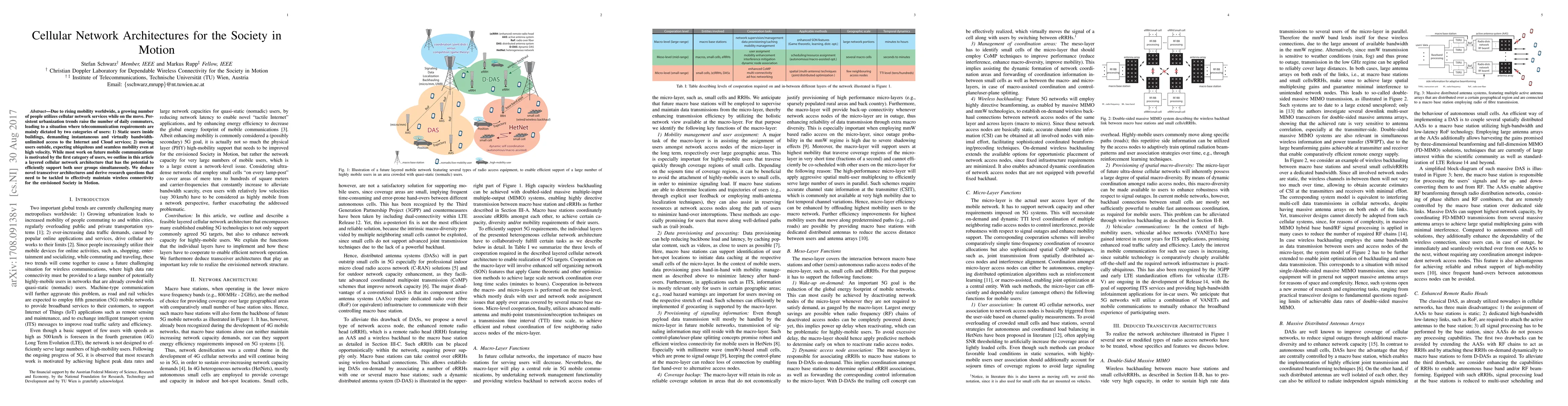 Due to rising mobility worldwide, a growing number of people utilizes cellular network services while on the move. Persistent urbanization trends raise the number of daily commuters, leading to a situation where telecommunication requirements are mainly dictated by two categories of users: 1) Static users inside buildings, demanding instantaneous and virtually bandwidth unlimited access to the Internet and Cloud services; 2) moving users outside, expecting ubiquitous and seamless mobility even at high velocity. While most work on future mobile communications is motivated by the first category of users, we outline in this article a layered cellular network architecture that has the potential to efficiently support both user groups simultaneously. We deduce novel transceiver architectures and derive research questions that need to be tackled to effectively maintain wireless connectivity for the envisioned Society in Motion.