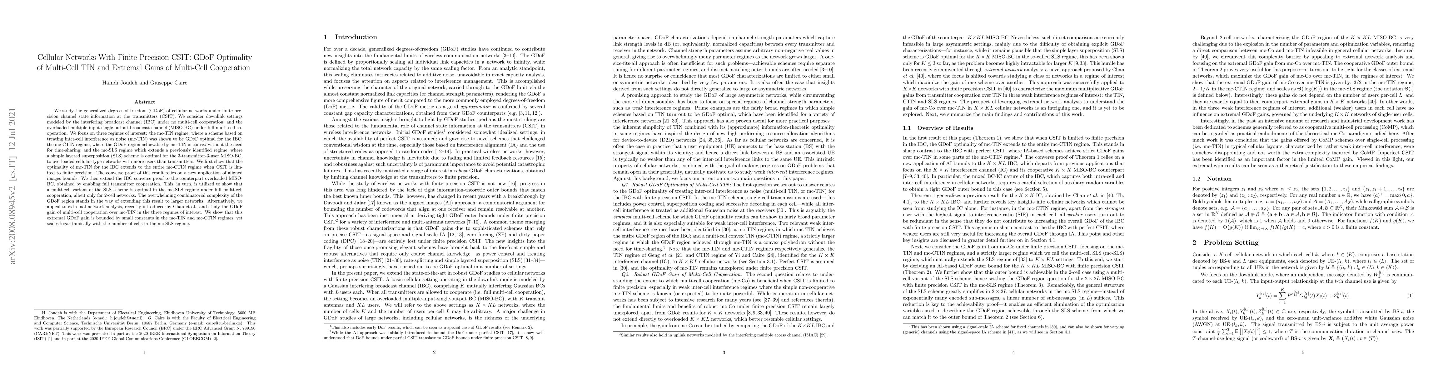 We study the generalized degrees-of-freedom (GDoF) of cellular networks under finite precision channel state information at the transmitters (CSIT). We consider downlink settings modeled by the interfering broadcast channel (IBC) under no multi-cell cooperation, and the overloaded multiple-input-single-output broadcast channel (MISO-BC) under full multi-cell cooperation. We focus on three regimes of interest: the mc-TIN regime, where a scheme based on treating inter-cell interference as noise (mc-TIN) was shown to be GDoF optimal for the IBC; the mc-CTIN regime, where the GDoF region achievable by mc-TIN is convex without the need for time-sharing; and the mc-SLS regime which extends a previously identified regime, where a simple layered superposition (SLS) scheme is optimal for the 3-transmitter-3-user MISO-BC, to overloaded cellular-type networks with more users than transmitters. We first show that the optimality of mc-TIN for the IBC extends to the entire mc-CTIN regime when CSIT is limited to finite precision. The converse proof of this result relies on a new application of aligned images bounds. We then extend the IBC converse proof to the counterpart overloaded MISO-BC, obtained by enabling full transmitter cooperation. This, in turn, is utilized to show that a multi-cell variant of the SLS scheme is optimal in the mc-SLS regime under full multi-cell cooperation, albeit only for 2-cell networks. The overwhelming combinatorial complexity of the GDoF region stands in the way of extending this result to larger networks. Alternatively, we appeal to extremal network analysis, recently introduced by Chan et al., and study the GDoF gain of multi-cell cooperation over mc-TIN in the three regimes of interest. We show that this extremal GDoF gain is bounded by small constants in the mc-TIN and mc-CTIN regimes, yet scales logarithmically with the number of cells in the mc-SLS regime.
