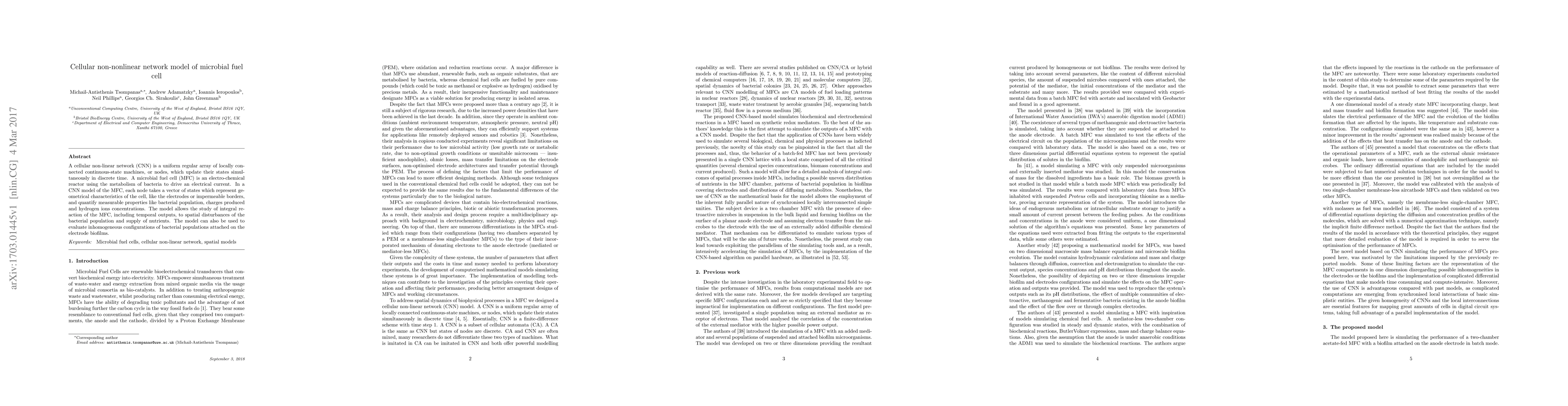 This paper proposes a cellular non-linear network model to simulate microbial fuel cells (MFCs), where each node represents geometrical and measurable properties of the cell. The model enables the study of MFC responses to spatial disturbances and inhomogeneous bacterial populations.