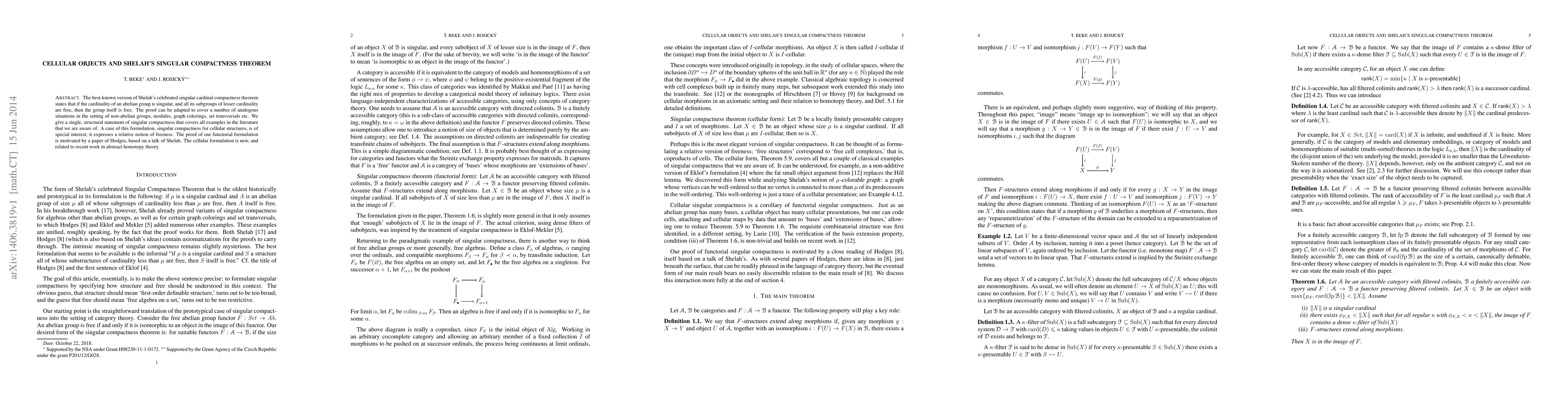 The best-known version of Shelah's celebrated singular cardinal compactness theorem states that if the cardinality of an abelian group is singular, and all its subgroups of lesser cardinality are free, then the group itself is free. The proof can be adapted to cover a number of analogous situations in the setting of non-abelian groups, modules, graph colorings, set transversals etc. We give a single, structural statement of singular compactness that covers all examples in the literature that we are aware of. A case of this formulation, singular compactness for cellular structures, is of special interest; it expresses a relative notion of freeness. The proof of our functorial formulation is motivated by a paper of Hodges, based on a talk of Shelah. The cellular formulation is new, and related to recent work in abstract homotopy theory.