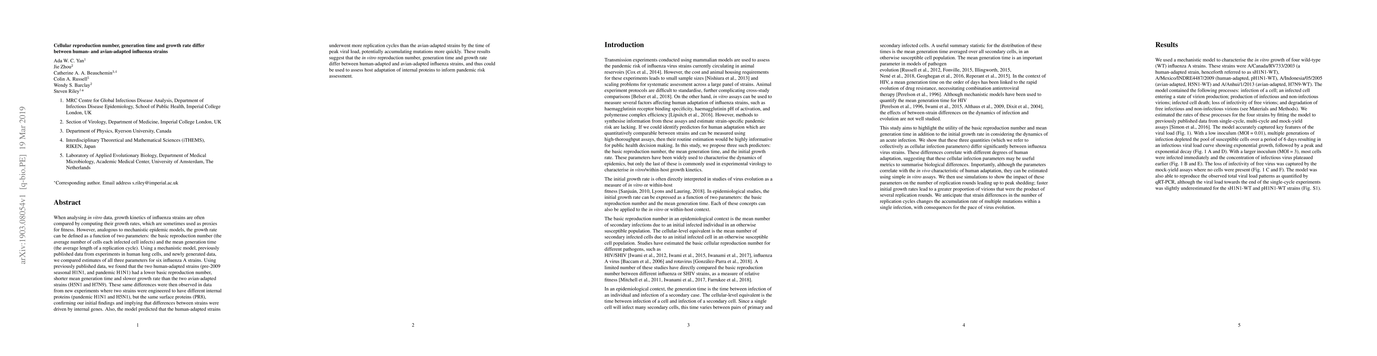 When analysing in vitro data, growth kinetics of influenza strains are often compared by computing their growth rates, which are sometimes used as proxies for fitness. However, analogous to mechanistic epidemic models, the growth rate can be defined as a function of two parameters: the basic reproduction number (the average number of cells each infected cell infects) and the mean generation time (the average length of a replication cycle). Using a mechanistic model, previously published data from experiments in human lung cells, and newly generated data, we compared estimates of all three parameters for six influenza A strains. Using previously published data, we found that the two human-adapted strains (pre-2009 seasonal H1N1, and pandemic H1N1) had a lower basic reproduction number, shorter mean generation time and slower growth rate than the two avian-adapted strains (H5N1 and H7N9). These same differences were then observed in data from new experiments where two strains were engineered to have different internal proteins (pandemic H1N1 and H5N1), but the same surface proteins (PR8), confirming our initial findings and implying that differences between strains were driven by internal genes. Also, the model predicted that the human-adapted strains underwent more replication cycles than the avian-adapted strains by the time of peak viral load, potentially accumulating mutations more quickly. These results suggest that the in vitro reproduction number, generation time and growth rate differ between human-adapted and avian-adapted influenza strains, and thus could be used to assess host adaptation of internal proteins to inform pandemic risk assessment.