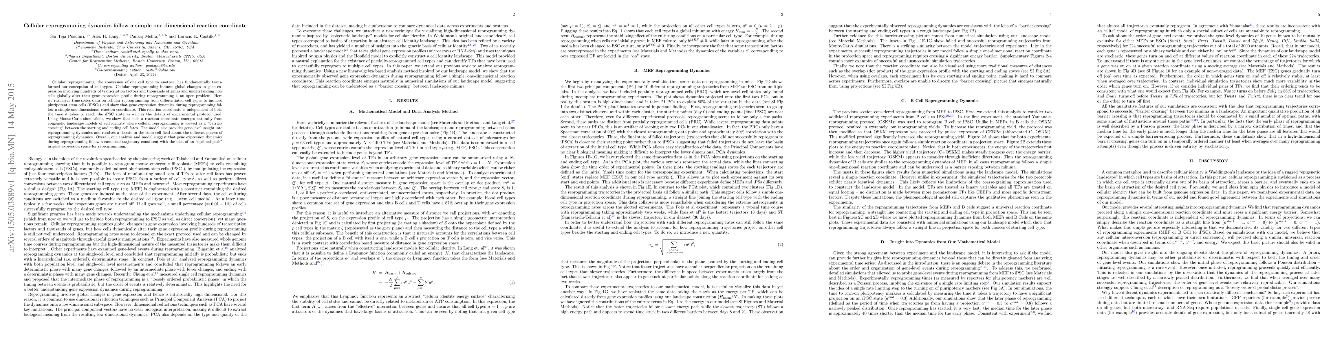 This paper demonstrates that cellular reprogramming from differentiated cells to induced pluripotent stem cells follows a one-dimensional reaction coordinate, independent of reprogramming time and experimental protocols. The model resolves debates about reprogramming phases and suggests an "optimal path" in gene expression space.