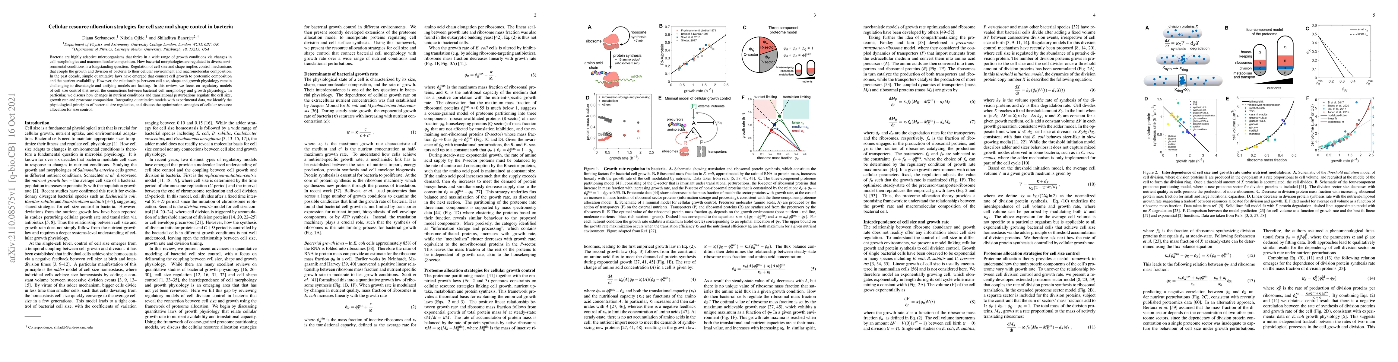This paper reviews regulatory models explaining how bacterial cell size and shape are controlled through resource allocation strategies, focusing on the connections between morphology, growth physiology, and environmental conditions. It highlights the optimization strategies that bacteria use to regulate cell size in response to nutrient availability and translational changes.