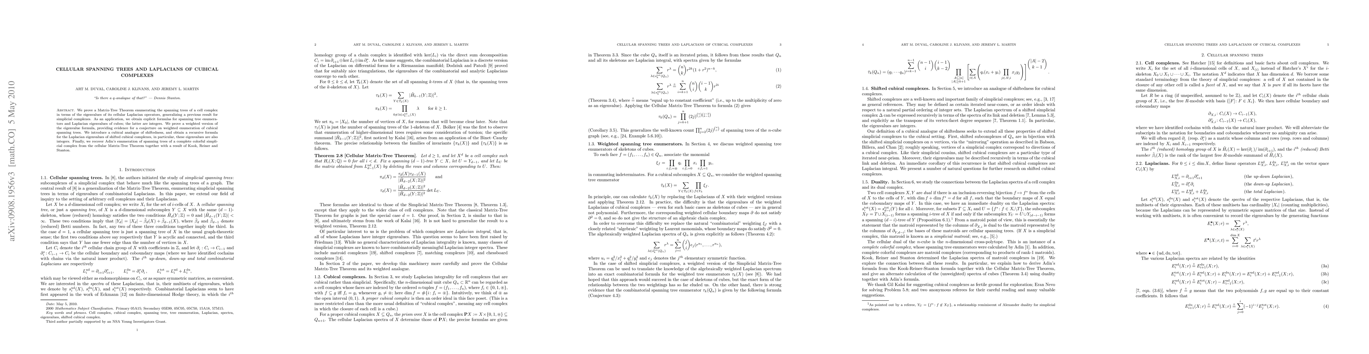 This paper generalizes the Matrix-Tree Theorem to cubical complexes, providing a formula for spanning trees using cellular Laplacian eigenvalues. It also establishes explicit formulas for cubes and proves a conjectured weighted enumeration of cubical spanning trees, introducing a cubical analogue of shiftedness.
