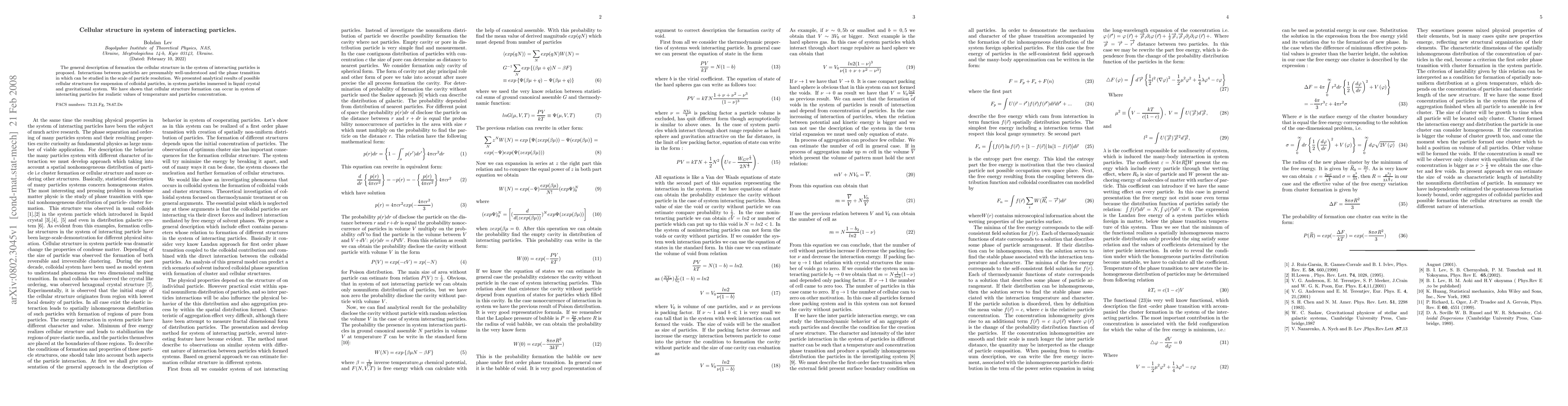 The general description of formation the cellular structure in the system of interacting particles is proposed. Interactions between particles are presumably well-understood and the phase transition in which can be studied in the scale of particle resolution. We presented analytical results of possible cellular structures for suspension of colloidal particles, in system particles immersed in liquid crystal and gravitational system. We have shown that cellular structure formation can occur in system of interacting particles for realistic values of temperature and particles concentration.