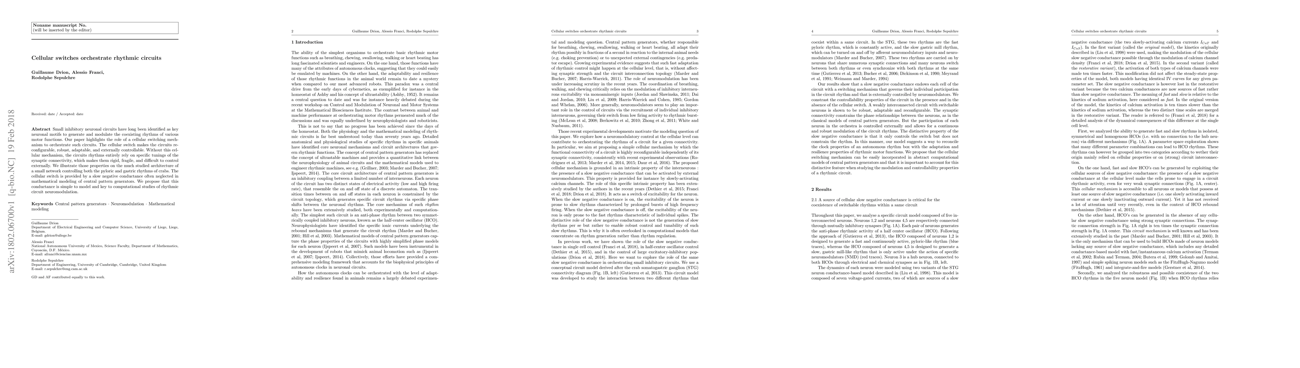 Small inhibitory neuronal circuits have long been identified as key neuronal motifs to generate and modulate the coexisting rhythms of various motor functions. Our paper highlights the role of a cellular switching mechanism to orchestrate such circuits. The cellular switch makes the circuits reconfigurable, robust, adaptable, and externally controllable. Without this cellular mechanism, the circuits rhythms entirely rely on specific tunings of the synaptic connectivity, which makes them rigid, fragile, and difficult to control externally. We illustrate those properties on the much studied architecture of a small network controlling both the pyloric and gastric rhythms of crabs. The cellular switch is provided by a slow negative conductance often neglected in mathematical modeling of central pattern generators. We propose that this conductance is simple to model and key to computational studies of rhythmic circuit neuromodulation.
