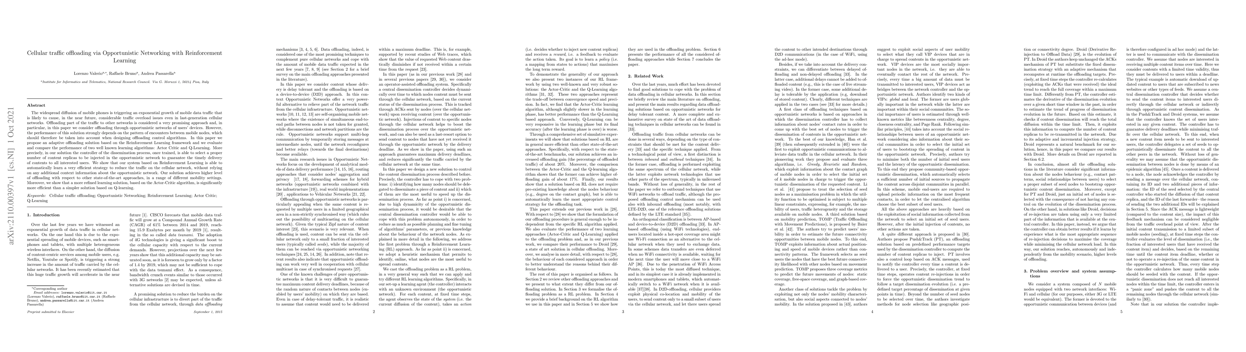 This paper proposes an adaptive traffic offloading solution using Opportunistic Networking and Reinforcement Learning to alleviate cellular network congestion. The study evaluates Actor-Critic and Q-Learning algorithms, demonstrating that the Actor-Critic approach achieves higher offloading efficiency compared to Q-Learning and other state-of-the-art methods.