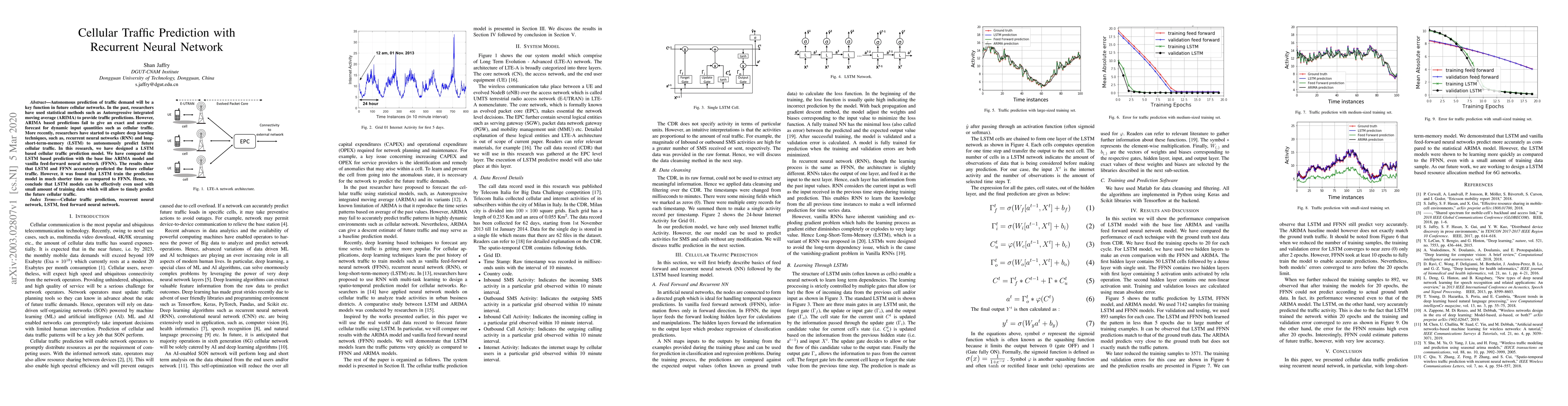 Autonomous prediction of traffic demand will be a key function in future cellular networks. In the past, researchers have used statistical methods such as Autoregressive integrated moving average (ARIMA) to provide traffic predictions. However, ARIMA based predictions fail to give an exact and accurate forecast for dynamic input quantities such as cellular traffic. More recently, researchers have started to explore deep learning techniques, such as, recurrent neural networks (RNN) and long-short-term-memory (LSTM) to autonomously predict future cellular traffic. In this research, we have designed a LSTM based cellular traffic prediction model. We have compared the LSTM based prediction with the base line ARIMA model and vanilla feed-forward neural network (FFNN). The results show that LSTM and FFNN accurately predicted future cellular traffic. However, it was found that LSTM train the prediction model in much shorter time as compared to FFNN. Hence, we conclude that LSTM models can be effectively even used with small amount of training data which will allow to timely predict future cellular traffic.