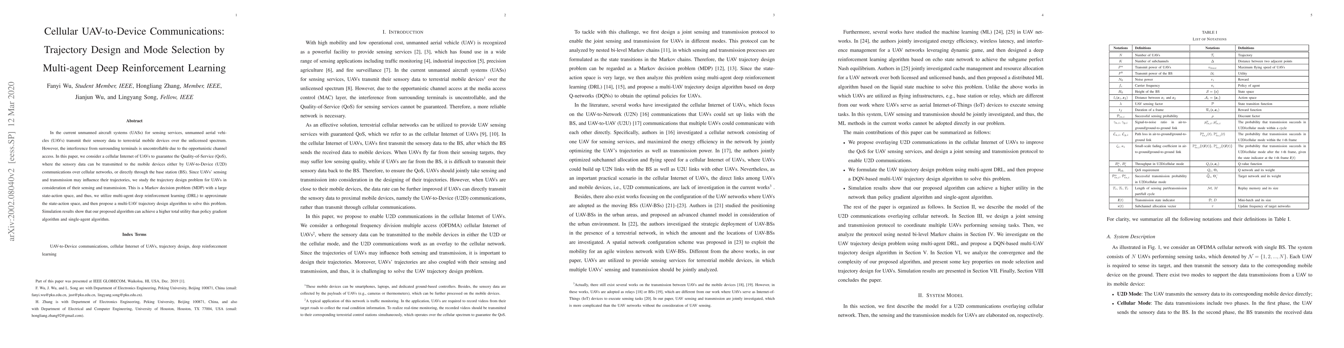 This paper explores cellular UAV-to-Device communications, addressing trajectory design and mode selection using multi-agent deep reinforcement learning to optimize Quality-of-Service amidst interference. The proposed algorithm outperforms traditional methods in achieving higher total utility.