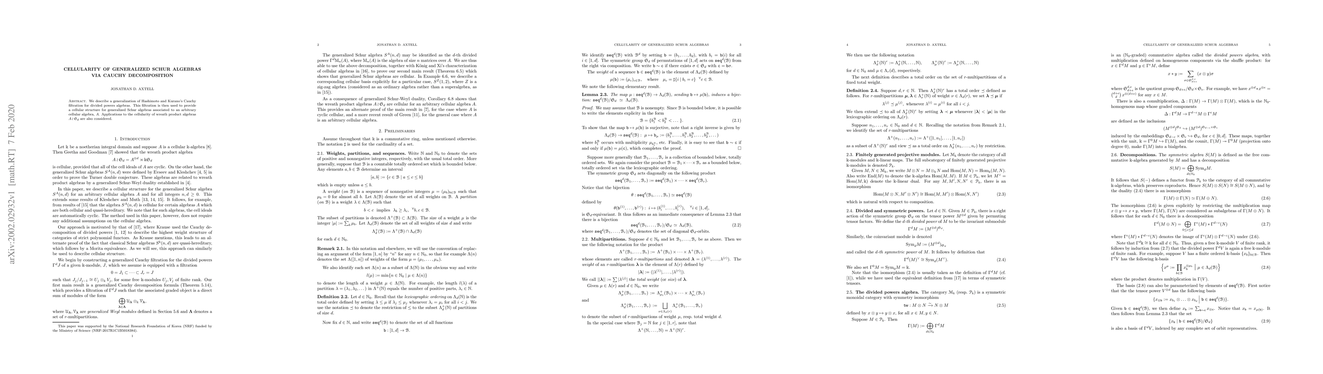 We describe a generalization of Hashimoto and Kurano's Cauchy filtration for divided powers algebras. This filtration is then used to provide a cellular structure for generalized Schur algebras associated to an arbitrary cellular algebra. Applications to the cellularity of wreath product algebras $A \wr \mathfrak{S}_d$ are also considered.
