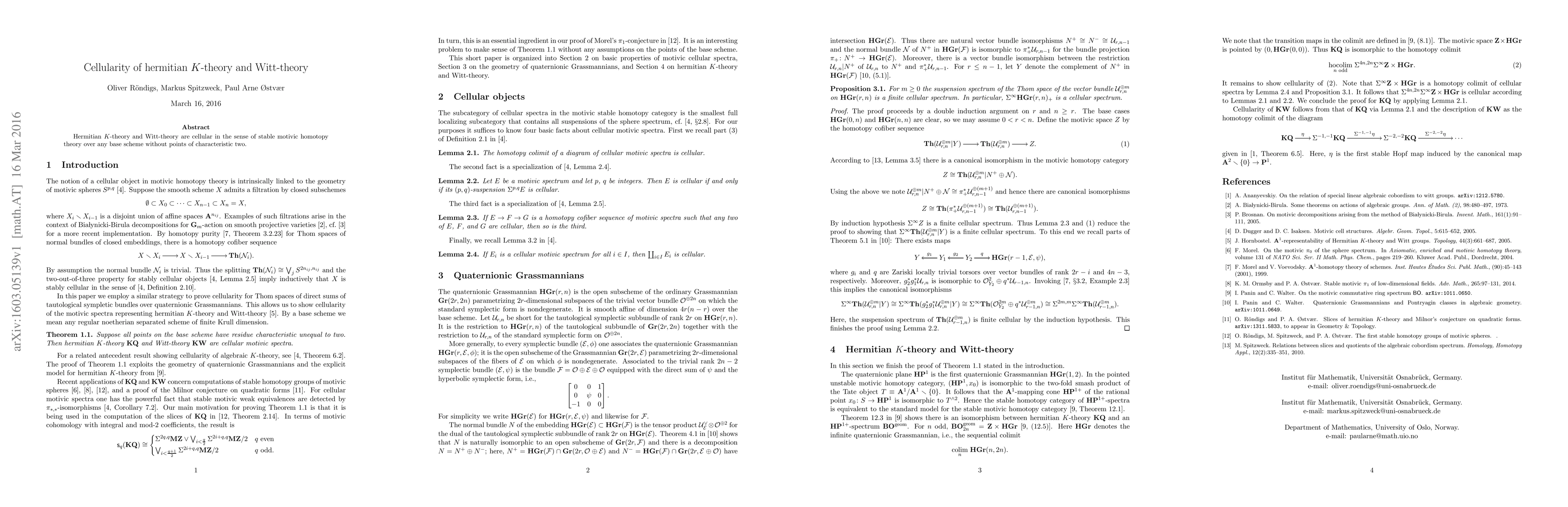 Summary: The paper demonstrates that hermitian K-theory and Witt theory exhibit cellular properties in stable motivic homotopy theory across any base scheme, excluding those with characteristic two. This cellularity provides a structured framework for understanding these theories.