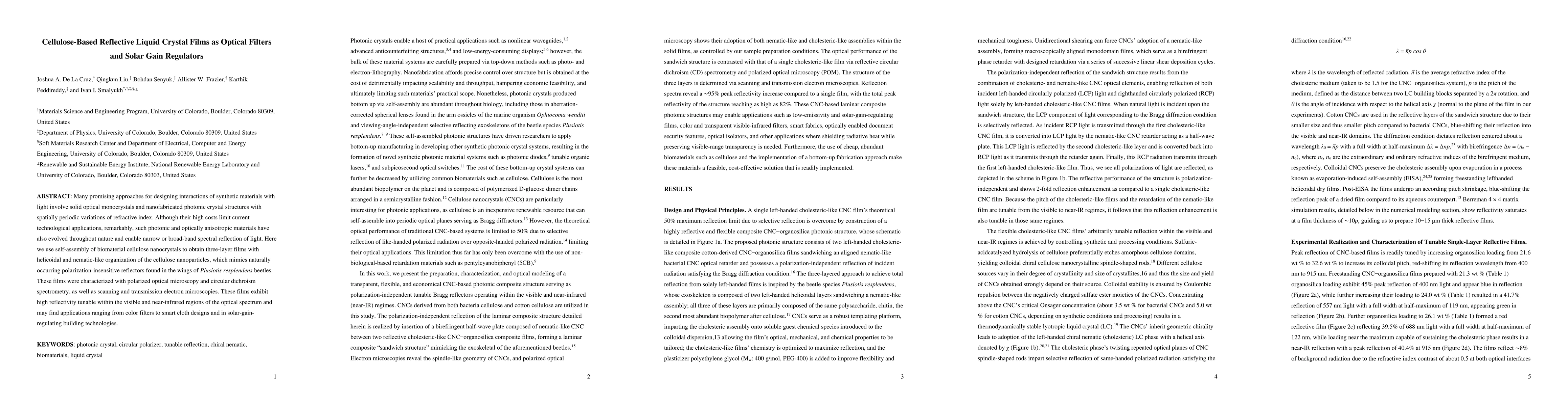 This paper presents cellulose-based reflective liquid crystal films created through self-assembly of cellulose nanocrystals, mimicking natural beetle wing reflectors. These films exhibit tunable high reflectivity in the visible and near-infrared spectrum, with potential applications in optical filters and solar-gain regulation.