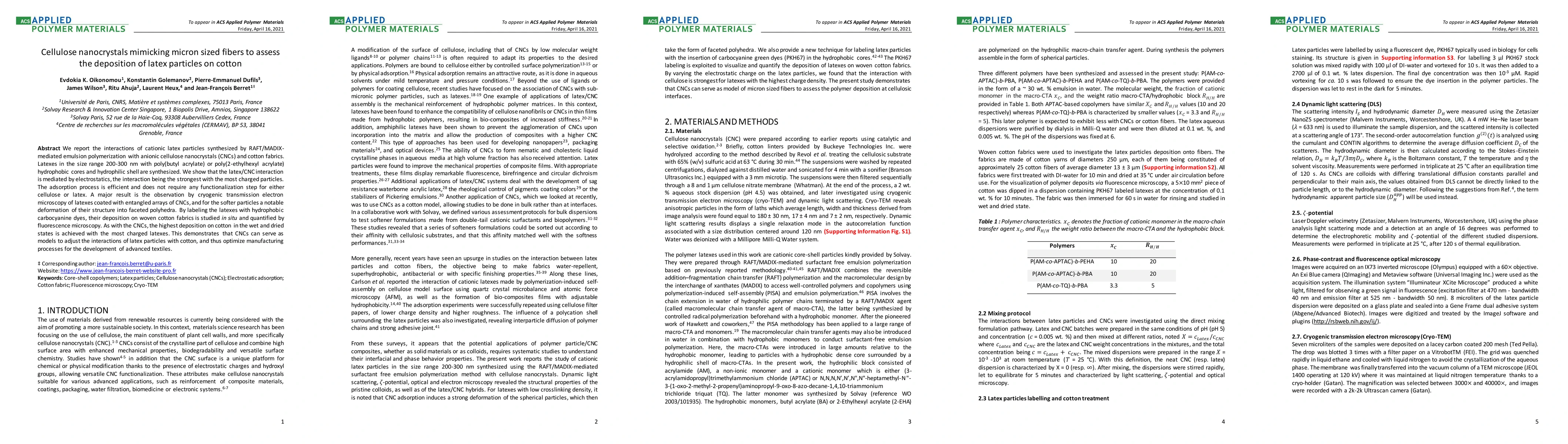 We report the interactions of cationic latex particles synthesized by RAFT/MADIX-mediated emulsion polymerization with anionic cellulose nanocrystals (CNCs) and cotton fabrics. Latexes in the size range 200-300 nm with poly(butyl acrylate) or poly(2-ethylhexyl acrylate) hydropho-bic cores and hydrophilic shell are synthesized. We show that the latex/CNC interaction is me-diated by electrostatics, the interaction being the strongest with the most charged particles. The adsorption process is efficient and does not require any functionalization step for either cellulose or latex. A major result is the observation by cryogenic transmission electron micros-copy of latexes coated with entangled arrays of CNCs, and for the softer particles a notable deformation of their structure into faceted polyhedra. By labeling the latexes with hydrophobic carbocyanine dyes, their deposition on woven cotton fabrics is studied in situ and quantified by fluorescence microscopy. As with the CNCs, the highest deposition on cotton in the wet and dried states is achieved with the most charged latexes. This demonstrates that CNCs can serve as models to adjust the interactions of latex particles with cotton, and thus optimize manufac-turing processes for the development of advanced textiles.
