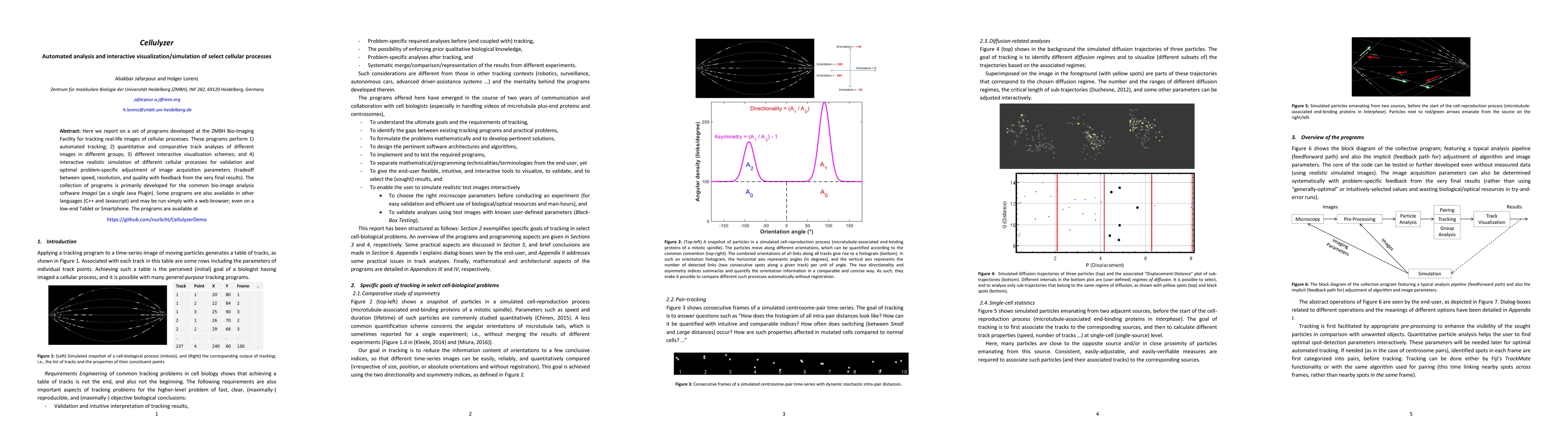Here we report on a set of programs developed at the ZMBH Bio-Imaging Facility for tracking real-life images of cellular processes. These programs perform 1) automated tracking; 2) quantitative and comparative track analyses of different images in different groups; 3) different interactive visualization schemes; and 4) interactive realistic simulation of different cellular processes for validation and optimal problem-specific adjustment of image acquisition parameters (tradeoff between speed, resolution, and quality with feedback from the very final results). The collection of programs is primarily developed for the common bio-image analysis software ImageJ (as a single Java Plugin). Some programs are also available in other languages (C++ and Javascript) and may be run simply with a web-browser; even on a low-end Tablet or Smartphone. The programs are available at https://github.com/nurlicht/CellulyzerDemo