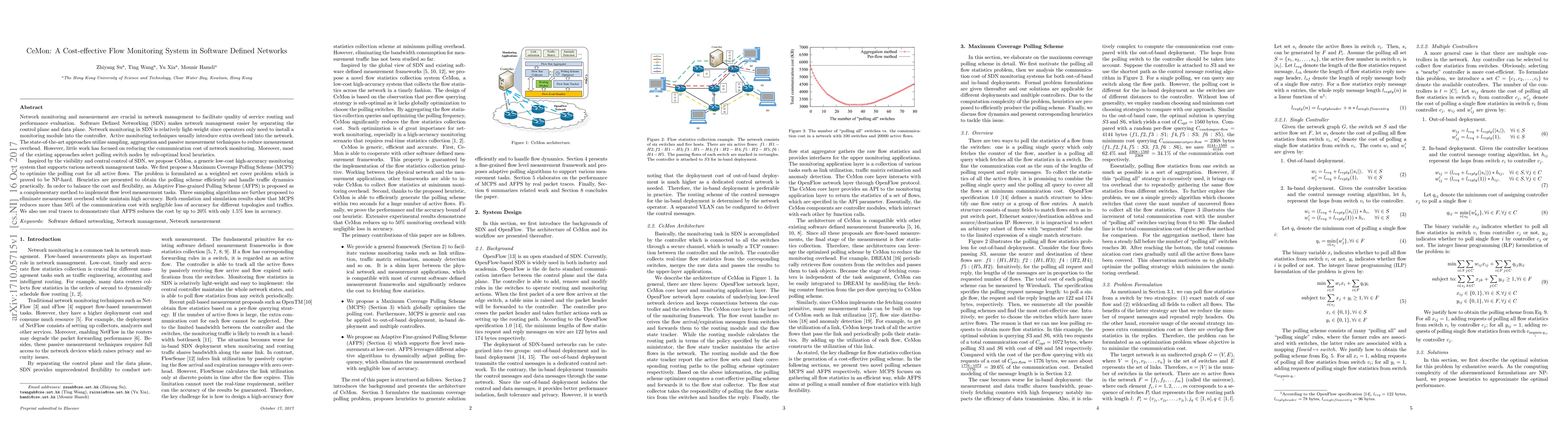 CeMon is a cost-effective flow monitoring system for Software Defined Networks (SDN) that optimizes communication costs through a Maximum Coverage Polling Scheme and Adaptive Fine-grained Polling Scheme. It significantly reduces monitoring overhead while maintaining high accuracy, demonstrating up to 50% reduction in communication cost in simulations and up to 20% in real traces.