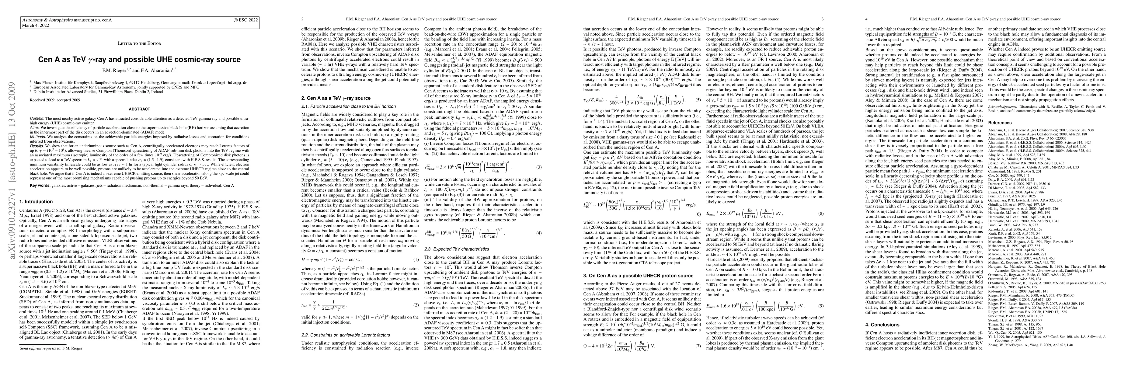 Context: The most nearby active galaxy Cen A has attracted considerable attention as a detected TeV gamma-ray and possible ultra-high energy (UHE) cosmic-ray emitter. Aims: We investigate the efficiency of particle acceleration close to the supermassive black hole (BH) horizon assuming that accretion in the innermost part of the disk occurs in an advection-dominated (ADAF) mode. Methods: We analyze the constraints on the achievable particle energies imposed by radiative losses and corotation for conditions inferred from observations. Results: We show that for an underluminous source such as Cen A, centrifugally accelerated electrons may reach Lorentz factors of up to $\gamma \sim (10^7-10^8)$, allowing inverse Compton (Thomson) upscattering of ADAF sub-mm disk photons into the TeV regime with an associated maximum (isotropic) luminosity of the order of a few times $10^{39}$ erg/s. Upscattering of Comptonized disk photons is expected to lead to a TeV spectrum $L_{\nu} \propto \nu^{-\alpha_c}$ with a spectral index $\alpha_c \simeq (1.5-1.9)$, consistent with H.E.S.S. results. The corresponding minimum variability timescale could be as low as $r_{\rm L}/c \sim 1$ hr for a typical light cylinder radius of $r_{\rm L} \simeq 5 r_{\rm s}$. While efficient electron acceleration appears to be well possible, protons are unlikely to be accelerated into the extreme UHECR regime close to the central black hole. We argue that if Cen A is indeed an extreme UHECR emitting source, then shear acceleration along the kpc-scale jet could represent one of the most promising mechanisms capable of pushing protons up to energies beyond 50 EeV.