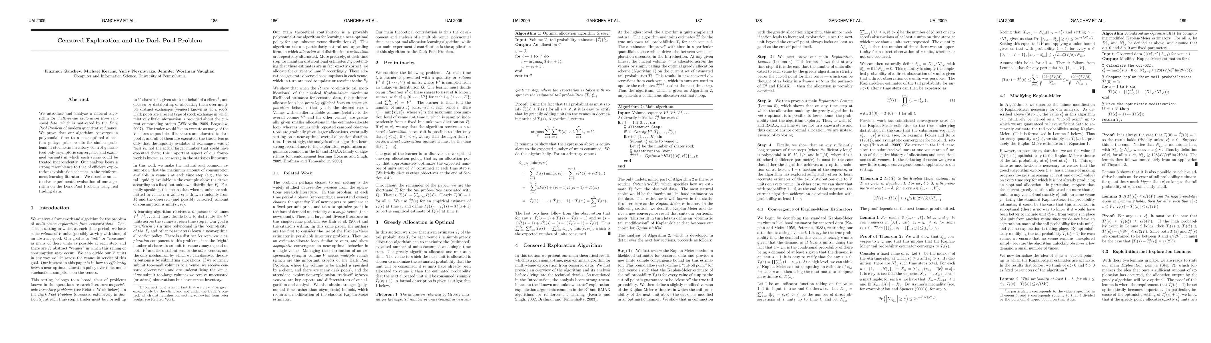We introduce and analyze a natural algorithm for multi-venue exploration from censored data, which is motivated by the Dark Pool Problem of modern quantitative finance. We prove that our algorithm converges in polynomial time to a near-optimal allocation policy; prior results for similar problems in stochastic inventory control guaranteed only asymptotic convergence and examined variants in which each venue could be treated independently. Our analysis bears a strong resemblance to that of efficient exploration/ exploitation schemes in the reinforcement learning literature. We describe an extensive experimental evaluation of our algorithm on the Dark Pool Problem using real trading data.