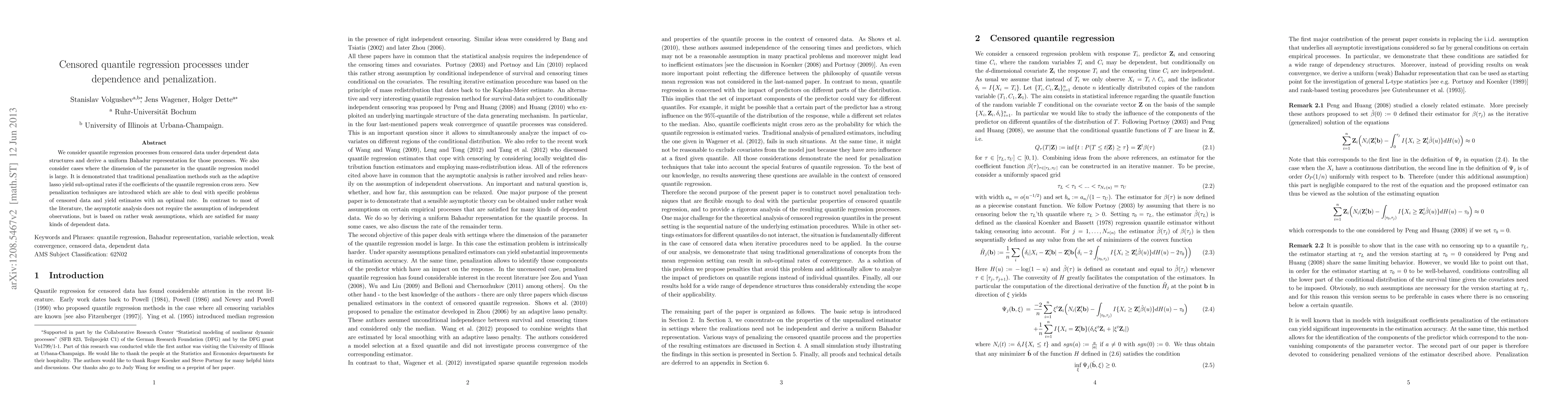 We consider quantile regression processes from censored data under dependent data structures and derive a uniform Bahadur representation for those processes. We also consider cases where the dimension of the parameter in the quantile regression model is large. It is demonstrated that traditional penalized estimators such as the adaptive lasso yield sub-optimal rates if the coefficients of the quantile regression cross zero. New penalization techniques are introduced which are able to deal with specific problems of censored data and yield estimates with an optimal rate. In contrast to most of the literature, the asymptotic analysis does not require the assumption of independent observations, but is based on rather weak assumptions, which are satisfied for many kinds of dependent data.