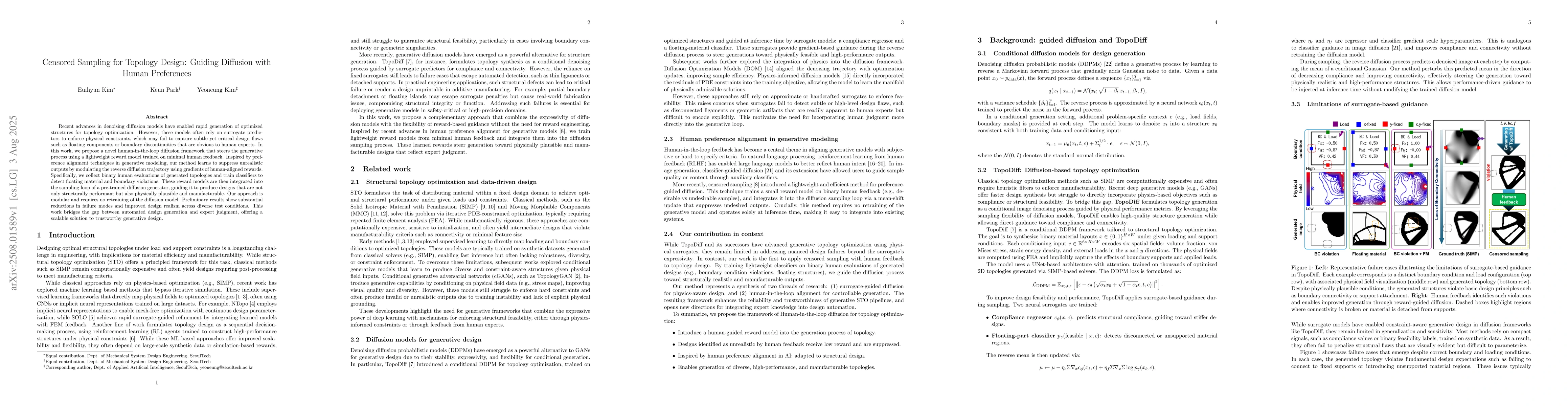 Recent advances in denoising diffusion models have enabled rapid generation of optimized structures for topology optimization. However, these models often rely on surrogate predictors to enforce physical constraints, which may fail to capture subtle yet critical design flaws such as floating components or boundary discontinuities that are obvious to human experts. In this work, we propose a novel human-in-the-loop diffusion framework that steers the generative process using a lightweight reward model trained on minimal human feedback. Inspired by preference alignment techniques in generative modeling, our method learns to suppress unrealistic outputs by modulating the reverse diffusion trajectory using gradients of human-aligned rewards. Specifically, we collect binary human evaluations of generated topologies and train classifiers to detect floating material and boundary violations. These reward models are then integrated into the sampling loop of a pre-trained diffusion generator, guiding it to produce designs that are not only structurally performant but also physically plausible and manufacturable. Our approach is modular and requires no retraining of the diffusion model. Preliminary results show substantial reductions in failure modes and improved design realism across diverse test conditions. This work bridges the gap between automated design generation and expert judgment, offering a scalable solution to trustworthy generative design.