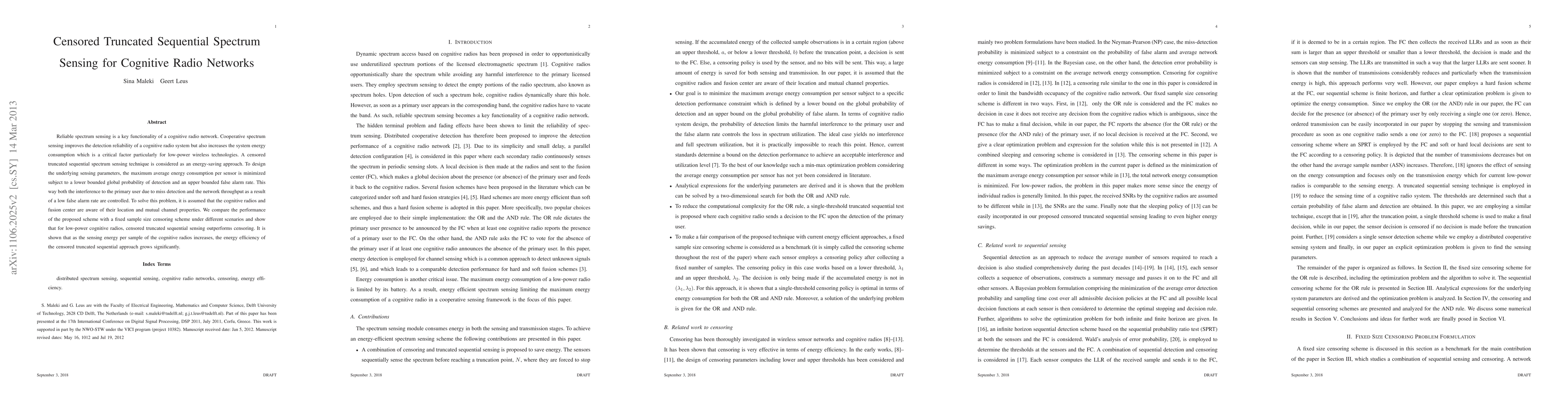 This paper proposes a censored truncated sequential spectrum sensing technique to enhance energy efficiency in cognitive radio networks while maintaining reliable spectrum sensing. The method minimizes energy consumption per sensor under constraints on detection probability and false alarm rate, demonstrating significant energy efficiency gains compared to fixed sample size schemes.