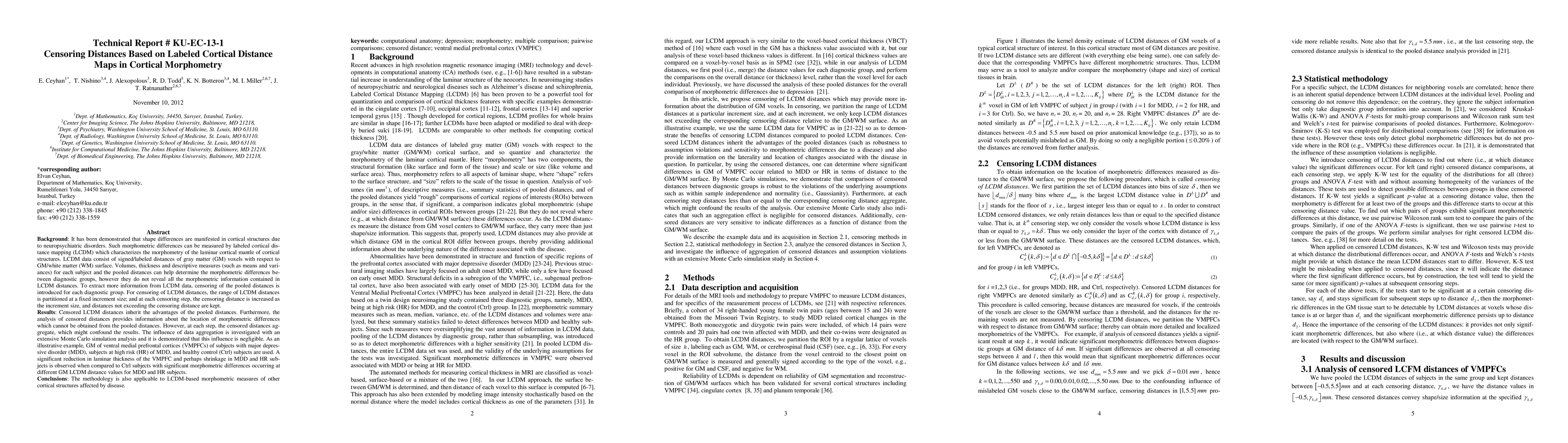 Shape differences are manifested in cortical structures due to neuropsychiatric disorders. Such differences can be measured by labeled cortical distance mapping (LCDM) which characterizes the morphometry of the laminar cortical mantle of cortical structures. LCDM data consist of signed distances of gray matter (GM) voxels with respect to GM/white matter (WM) surface. Volumes and descriptive measures (such as means and variances) for each subject and the pooled distances provide the morphometric differences between diagnostic groups, but they do not reveal all the morphometric information contained in LCDM distances. To extract more information from LCDM data, censoring of the distances is introduced. For censoring of LCDM distances, the range of LCDM distances is partitioned at a fixed increment size; and at each censoring step, and distances not exceeding the censoring distance are kept. Censored LCDM distances inherit the advantages of the pooled distances. Furthermore, the analysis of censored distances provides information about the location of morphometric differences which cannot be obtained from the pooled distances. However, at each step, the censored distances aggregate, which might confound the results. The influence of data aggregation is investigated with an extensive Monte Carlo simulation analysis and it is demonstrated that this influence is negligible. As an illustrative example, GM of ventral medial prefrontal cortices (VMPFCs) of subjects with major depressive disorder (MDD), subjects at high risk (HR) of MDD, and healthy control (Ctrl) subjects are used. A significant reduction in laminar thickness of the VMPFC and perhaps shrinkage in MDD and HR subjects is observed when compared to Ctrl subjects. The methodology is also applicable to LCDM-based morphometric measures of other cortical structures affected by disease.