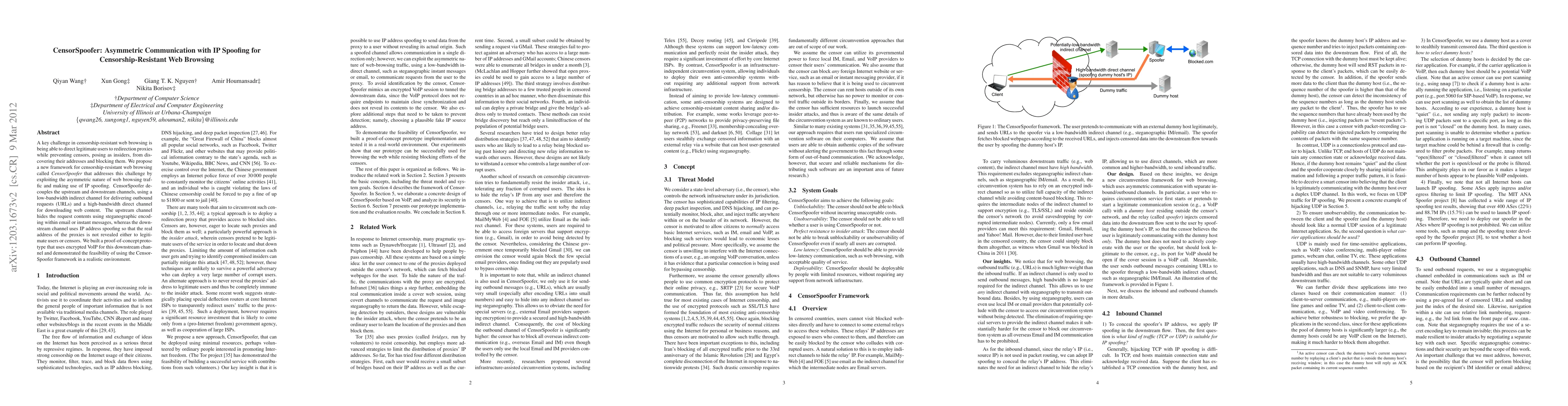 **Summary:** CensorSpoofer is a framework for censorship-resistant web browsing that uses asymmetric communication with IP spoofing to protect legitimate users from censors. It employs a low-bandwidth upstream channel for outbound requests and a high-bandwidth downstream channel for web content, with steganographic encoding and spoofed IP addresses to hide proxy locations.