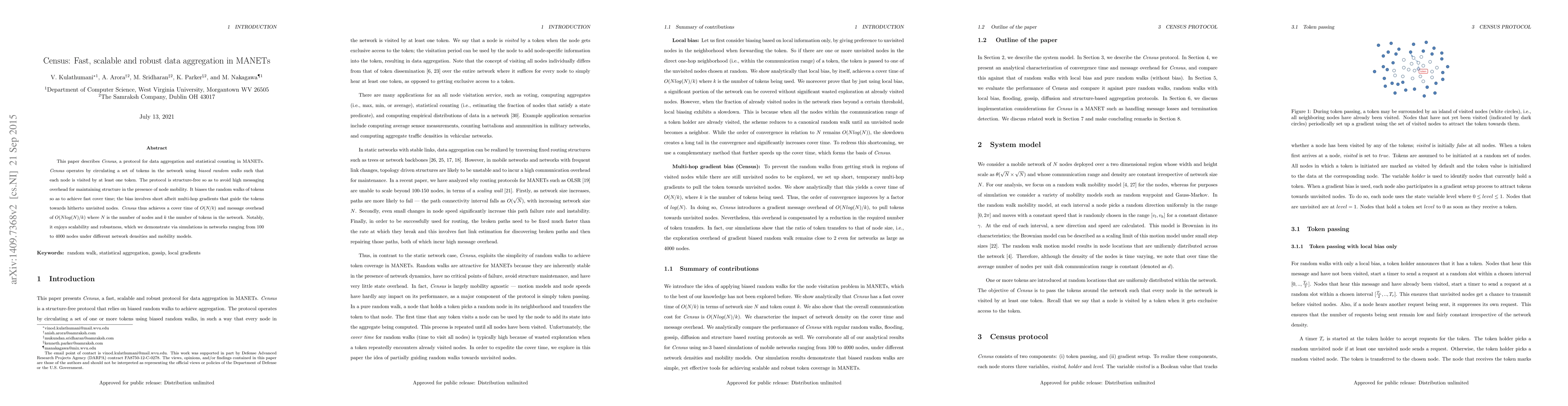 The Census protocol aggregates data in Mobile Ad-hoc NETworks (MANETs) using biased random walks, ensuring each node is visited by at least one token. It achieves fast cover time (O(N/k)) and low message overhead (O(Nlog(N)/k)), demonstrating scalability and robustness in simulations with 100 to 4000 nodes under various conditions.