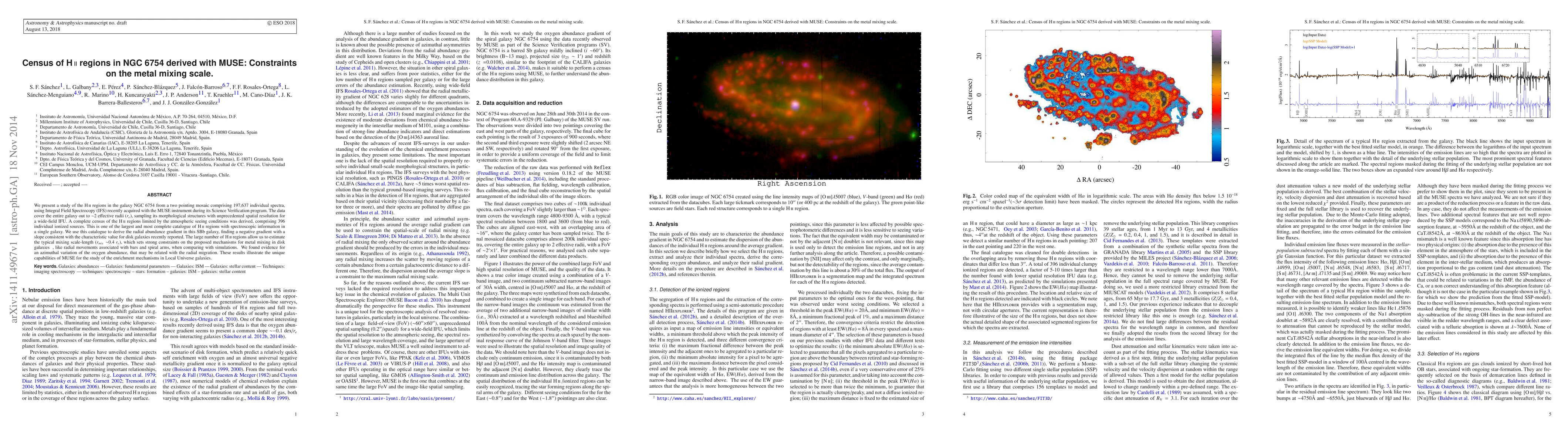We present a study of the HII regions in the galaxy NGC 6754 from a two pointing mosaic comprising 197,637 individual spectra, using Integral Field Spectrocopy (IFS) recently acquired with the MUSE instrument during its Science Verification program. The data cover the entire galaxy out to ~2 effective radii (re ), sampling its morphological structures with unprecedented spatial resolution for a wide-field IFU. A complete census of the H ii regions limited by the atmospheric seeing conditions was derived, comprising 396 individual ionized sources. This is one of the largest and most complete catalogue of H ii regions with spectroscopic information in a single galaxy. We use this catalogue to derive the radial abundance gradient in this SBb galaxy, finding a negative gradient with a slope consistent with the characteristic value for disk galaxies recently reported. The large number of H ii regions allow us to estimate the typical mixing scale-length (rmix ~0.4 re ), which sets strong constraints on the proposed mechanisms for metal mixing in disk galaxies, like radial movements associated with bars and spiral arms, when comparing with simulations. We found evidence for an azimuthal variation of the oxygen abundance, that may be related with the radial migration. These results illustrate the unique capabilities of MUSE for the study of the enrichment mechanisms in Local Universe galaxies.