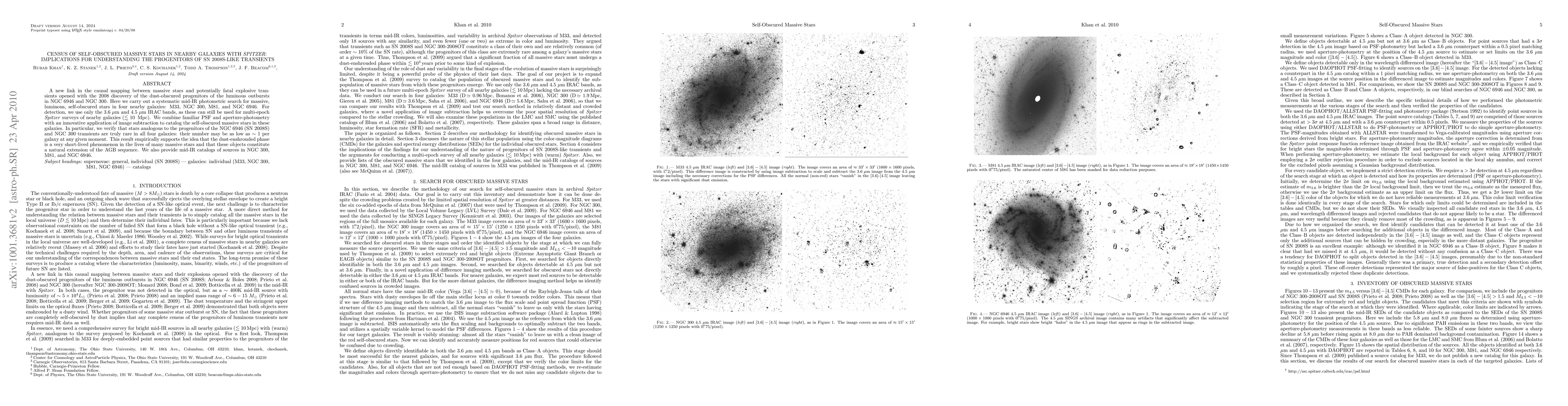 A new link in the causal mapping between massive stars and potentially fatal explosive transients opened with the 2008 discovery of the dust-obscured progenitors of the luminous outbursts in NGC 6946 and NGC 300. Here we carry out a systematic mid-IR photometric search for massive, luminous, self-obscured stars in four nearby galaxies: M33, NGC 300, M81, and NGC 6946. For detection, we use only the 3.6 micron and 4.5 micron IRAC bands, as these can still be used for multi-epoch Spitzer surveys of nearby galaxies (=<10 Mpc). We combine familiar PSF and aperture-photometry with an innovative application of image subtraction to catalog the self-obscured massive stars in these galaxies. In particular, we verify that stars analogous to the progenitors of the NGC 6946 (SN 2008S) and NGC 300 transients are truly rare in all four galaxies: their number may be as low as ~1 per galaxy at any given moment. This result empirically supports the idea that the dust-enshrouded phase is a very short-lived phenomenon in the lives of many massive stars and that these objects constitute a natural extension of the AGB sequence. We also provide mid-IR catalogs of sources in NGC 300, M81, and NGC 6946.