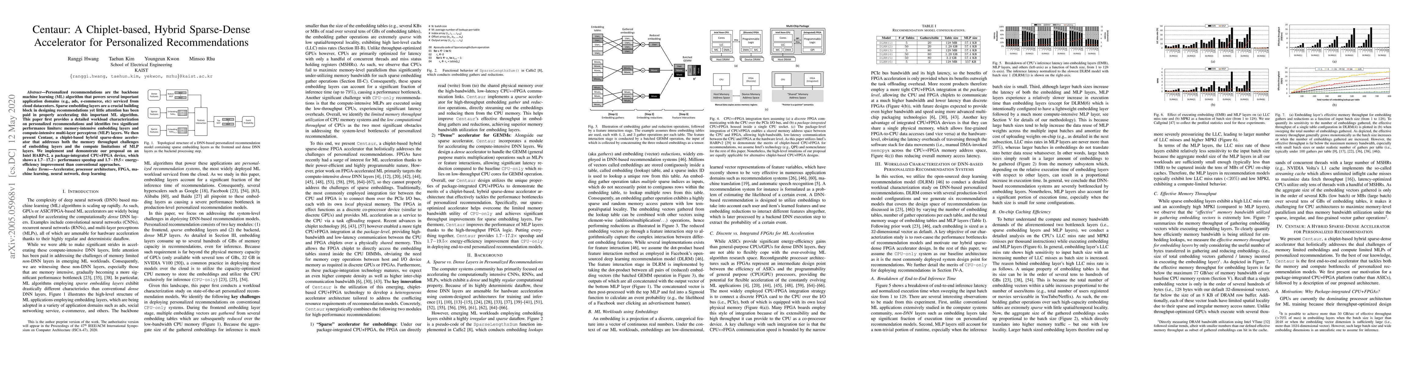 This paper introduces Centaur, a chiplet-based hybrid sparse-dense accelerator designed to enhance personalized recommendation algorithms. It addresses memory throughput issues in sparse embedding layers and compute limitations in multi-layer perceptron layers, achieving significant performance and energy efficiency improvements over conventional methods.