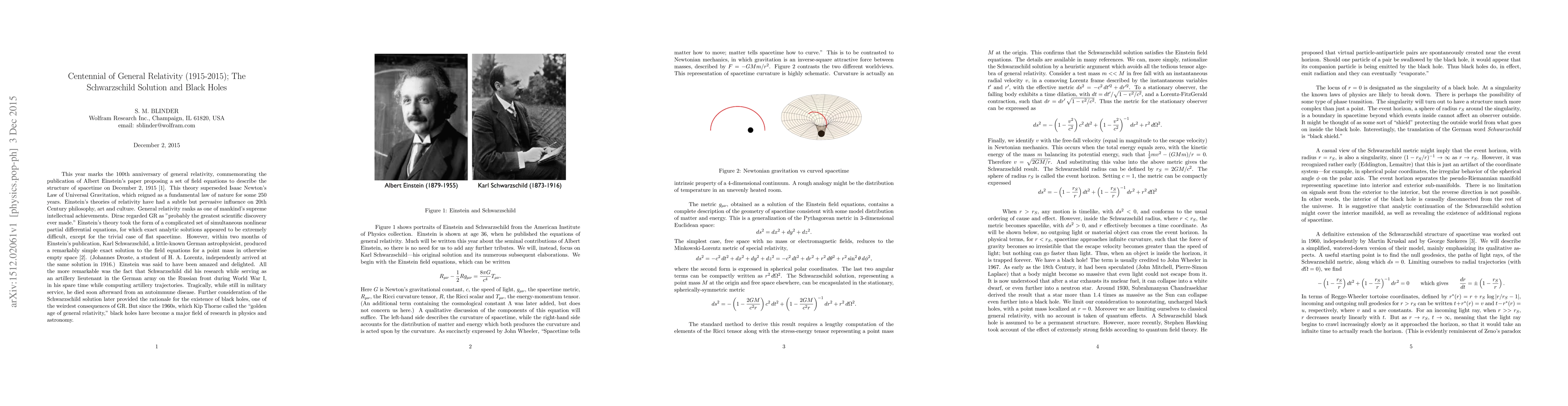 The paper celebrates the 100th anniversary of General Relativity by focusing on Karl Schwarzschild's groundbreaking solution, which predicted black holes. This discovery has inspired further research, including Penrose diagrams and quantum effects in black holes.