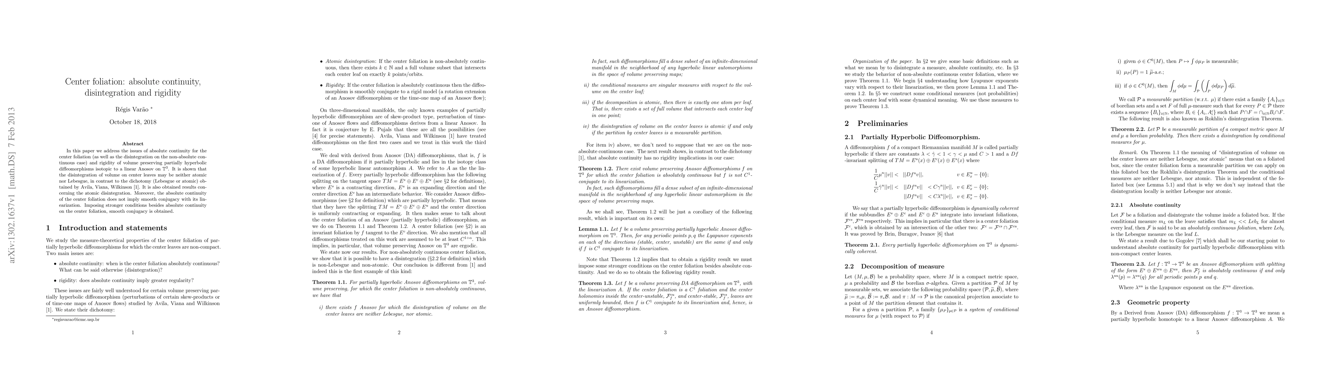 This paper investigates the absolute continuity, disintegration, and rigidity of center foliations in volume-preserving partially hyperbolic diffeomorphisms. It demonstrates that volume disintegration on center leaves may not be atomic or Lebesgue, and establishes conditions for smooth conjugacy beyond mere absolute continuity.