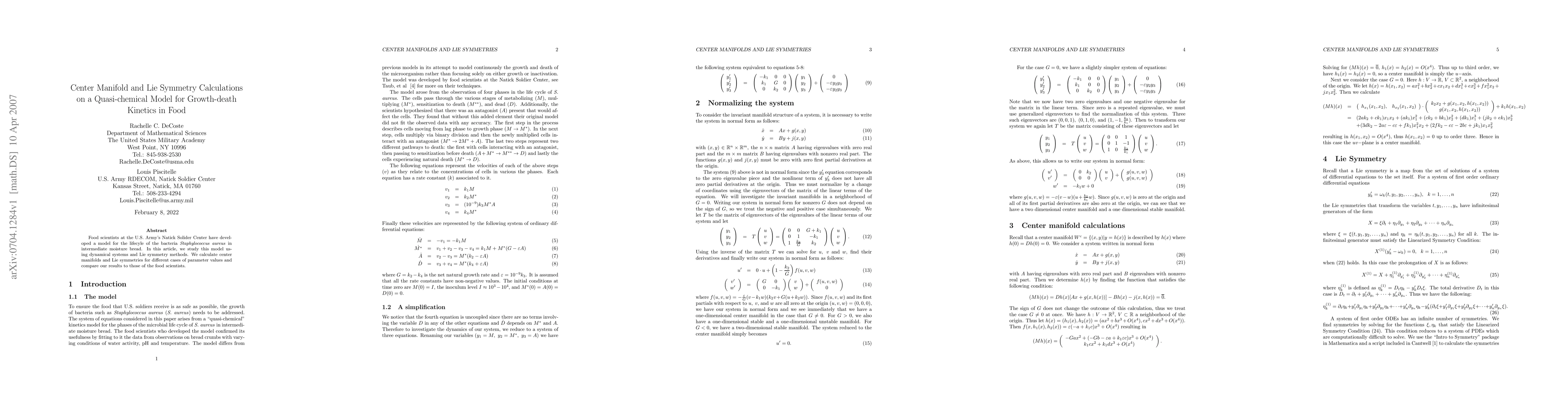 Food scientists at the U.S. Army's Natick Solider Center have developed a model for the lifecyle of the bacteria Staphylococcus aureus in intermediate moisture bread. In this article, we study this model using dynamical systems and Lie symmetry methods. We calculate center manifolds and Lie symmetries for different cases of parameter values and compare our results to those of the food scientists.