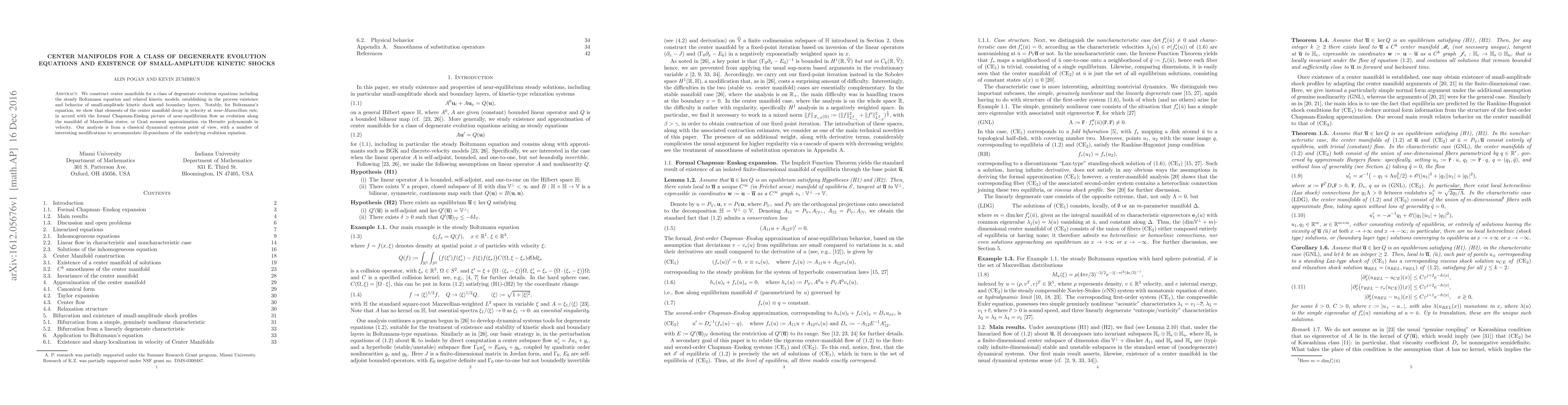 We construct center manifolds for a class of degenerate evolution equations including the steady Boltzmann equation and related kinetic models, establishing in the process existence and behavior of small-amplitude kinetic shock and boundary layers. Notably, for Boltzmann's equation, we show that elements of the center manifold decay in velocity at near-Maxwellian rate, in accord with the formal Chapman-Enskog picture of near-equilibrium ow as evolution along the manifold of Maxwellian states, or Grad moment approximation via Hermite polynomials in velocity. Our analysis is from a classical dynamical systems point of view, with a number of interesting modifications to accommodate ill-posedness of the underlying evolution equation.