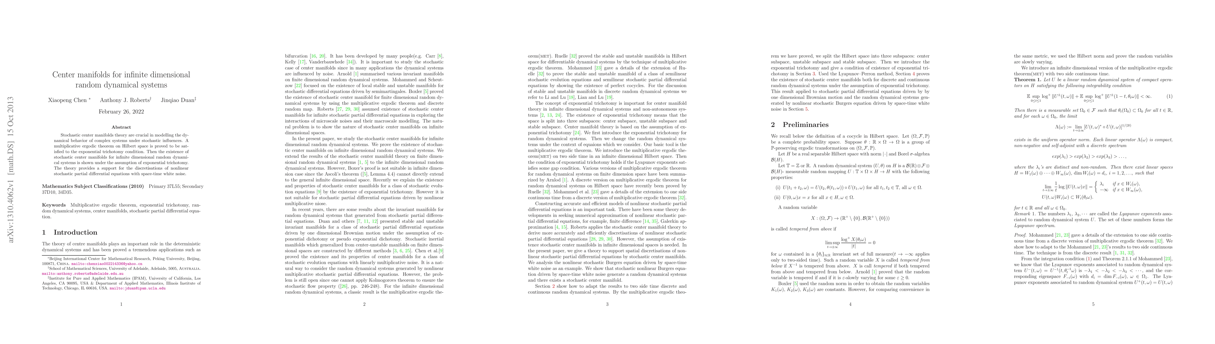 The paper presents a novel multiplicative ergodic theorem on Hilbert space and its application to prove the existence of stochastic center manifolds for infinite dimensional random dynamical systems.