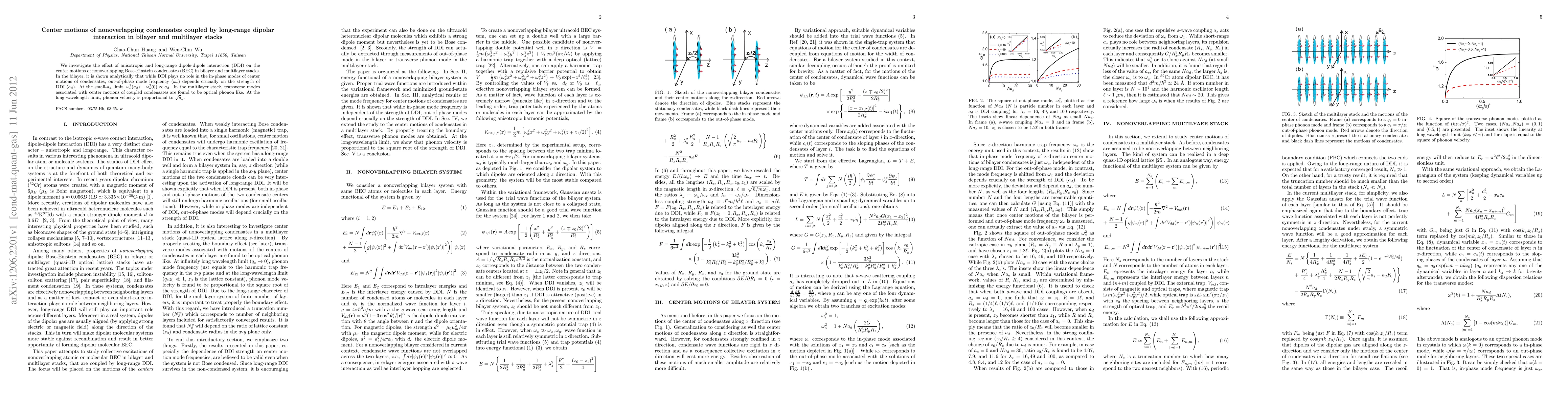 This paper examines the influence of long-range dipolar interactions on the center motions of nonoverlapping Bose-Einstein condensates in bilayer and multilayer configurations. In bilayers, out-of-phase center motion frequencies depend on the interaction strength, while in-phase modes remain unaffected. In multilayer stacks, center motions exhibit optical phonon-like behavior, with phonon velocity proportional to the square root of the interaction strength.