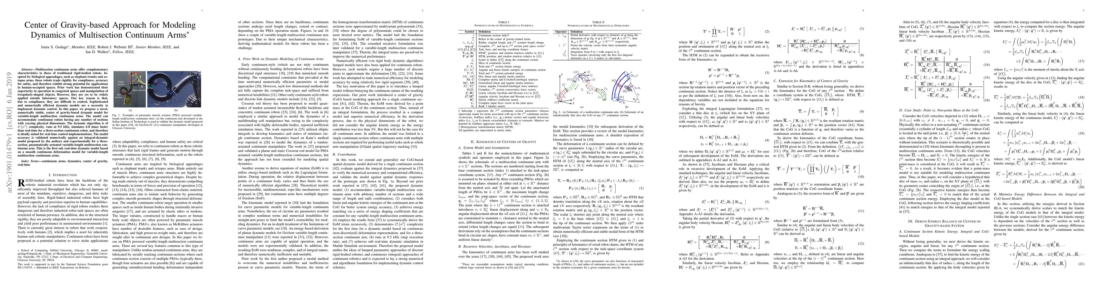 This paper proposes a numerically stable, center of gravity-based dynamic model for multisection continuum arms, which is efficient and suitable for real-time control. The model, with O(n²) complexity, is validated both numerically and experimentally for a three-section continuum robot.