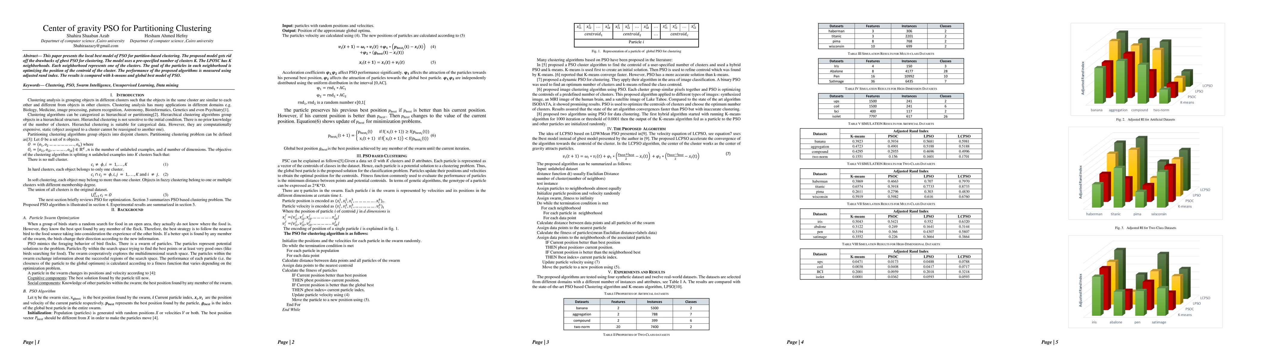 This paper introduces a local best Particle Swarm Optimization (LPOSC) model for partition-based clustering, which optimizes cluster centroids within K neighborhoods. The performance is evaluated using the adjusted rand index, showing improved results compared to k-means and the global best PSO model.