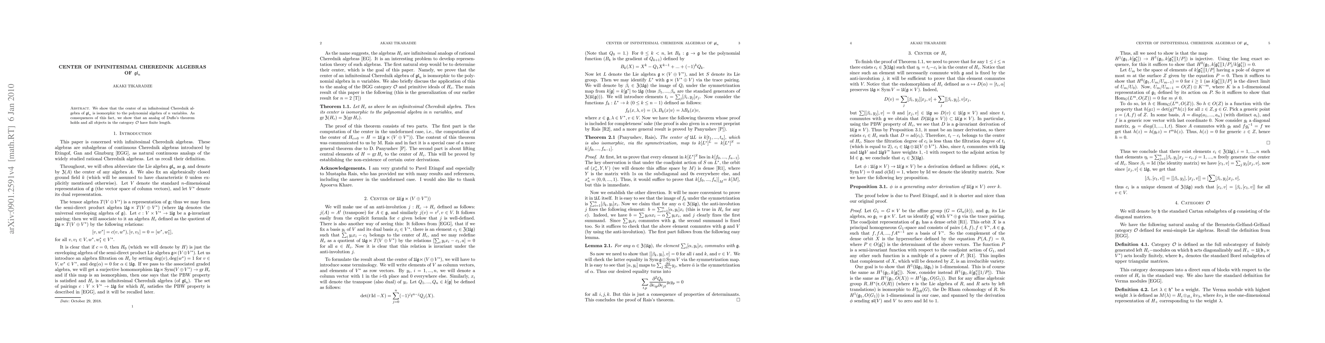This paper demonstrates that the center of infinitesimal Cherednik algebras associated with gl_n is isomorphic to a polynomial algebra in n variables, with implications for the representation theory of these algebras.