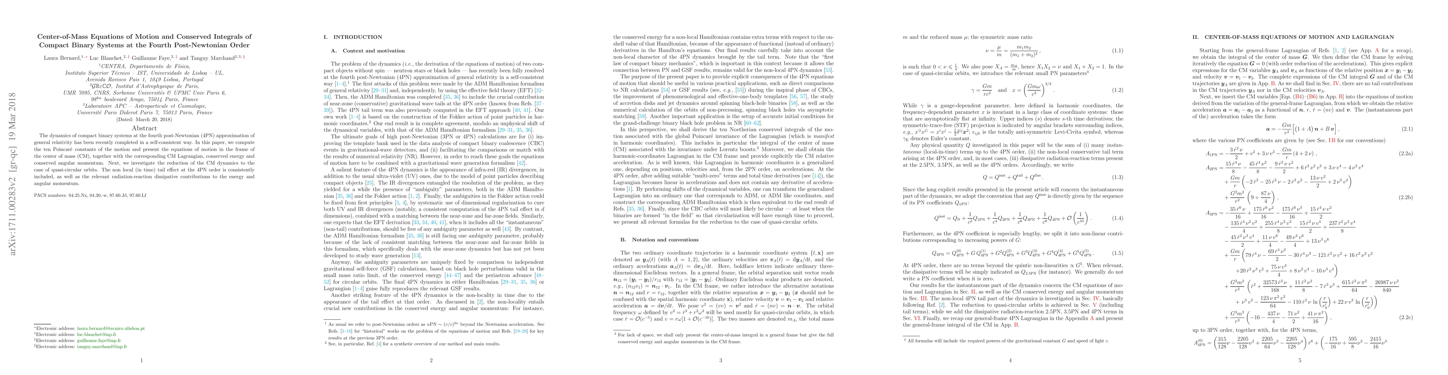 This paper presents the center-of-mass equations of motion and conserved integrals for compact binary systems at the fourth post-Newtonian order, including the ten Poincaré constants, CM Lagrangian, and effects of radiation-reaction. It also explores the dynamics for quasi-circular orbits, incorporating non-local tail effects.