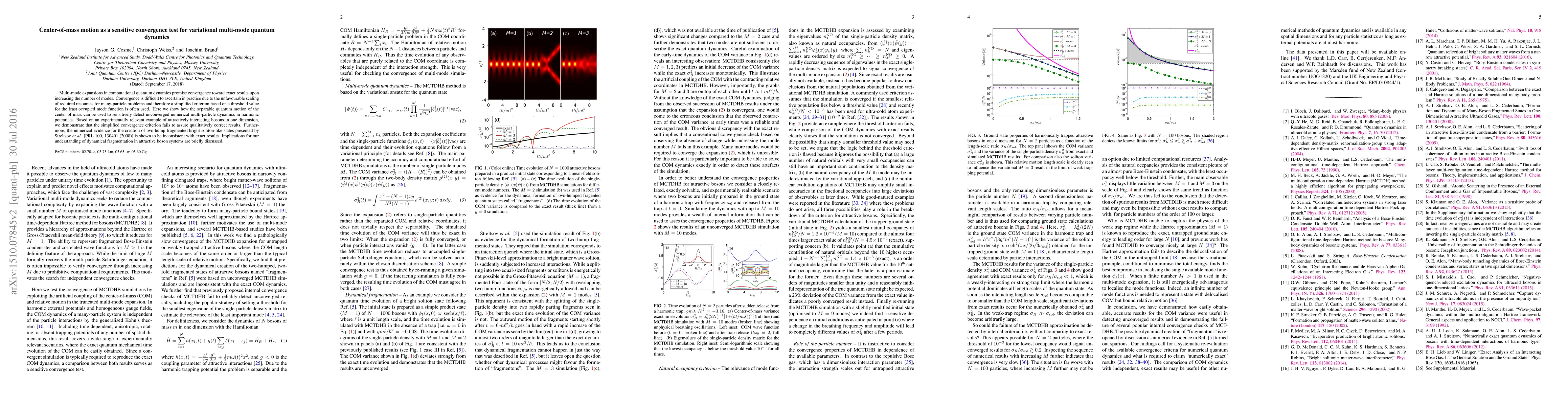 Multi-mode expansions in computational quantum dynamics promise convergence toward exact results upon increasing the number of modes. Convergence is difficult to ascertain in practice due to the unfavourable scaling of required resources for many-particle problems and therefore a simplified criterion based on a threshold value for the least occupied mode function is often used. Here we show how the separable quantum motion of the center of mass can be used to sensitively detect unconverged numerical multi-particle dynamics in harmonic potentials. Based on an experimentally relevant example of attractively interacting bosons in one dimension, we demonstrate that the simplified convergence criterion fails to assure qualitatively correct results. Furthermore, the numerical evidence for the creation of two-hump fragmented bright soliton-like states presented by Streltsov \emph{et al.} [PRL 100, 130401 (2008)] is shown to be inconsistent with exact results. Implications for our understanding of dynamical fragmentation in attractive boson systems are briefly discussed.