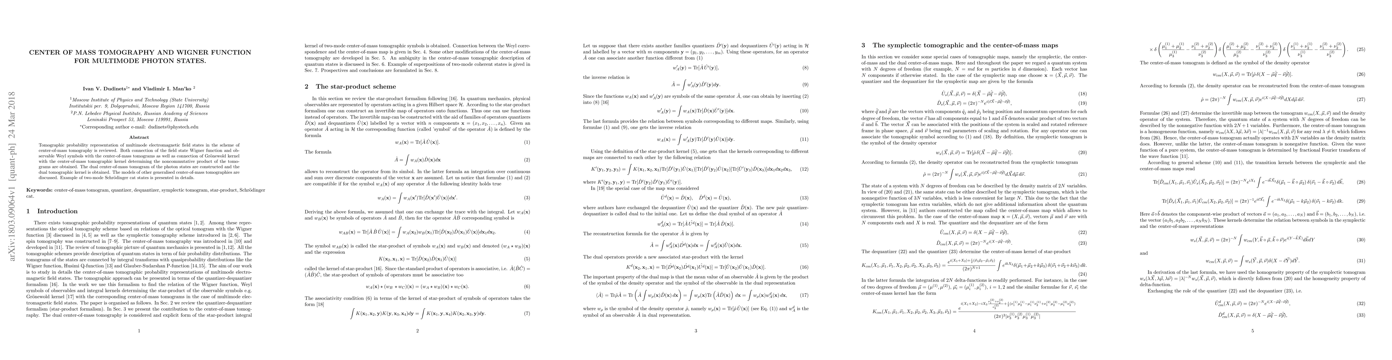 This paper reviews the center-of-mass tomography for multimode electromagnetic field states, establishing connections between the field state Wigner function, observable Weyl symbols, and center-of-mass tomograms, including the noncommutative product determined by the center-of-mass tomographic kernel. A dual center-of-mass tomogram for photon states and generalized models are also discussed, with a detailed example of two-mode Schrödinger cat states.