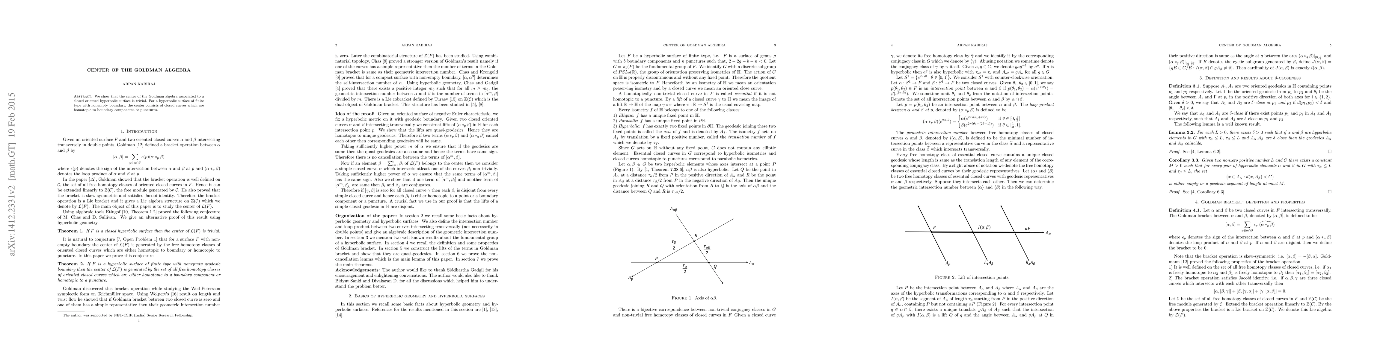 Summary: The center of the Goldman algebra for a closed oriented hyperbolic surface is trivial, while for a hyperbolic surface of finite type with boundary, it comprises curves homotopic to boundary components or punctures.